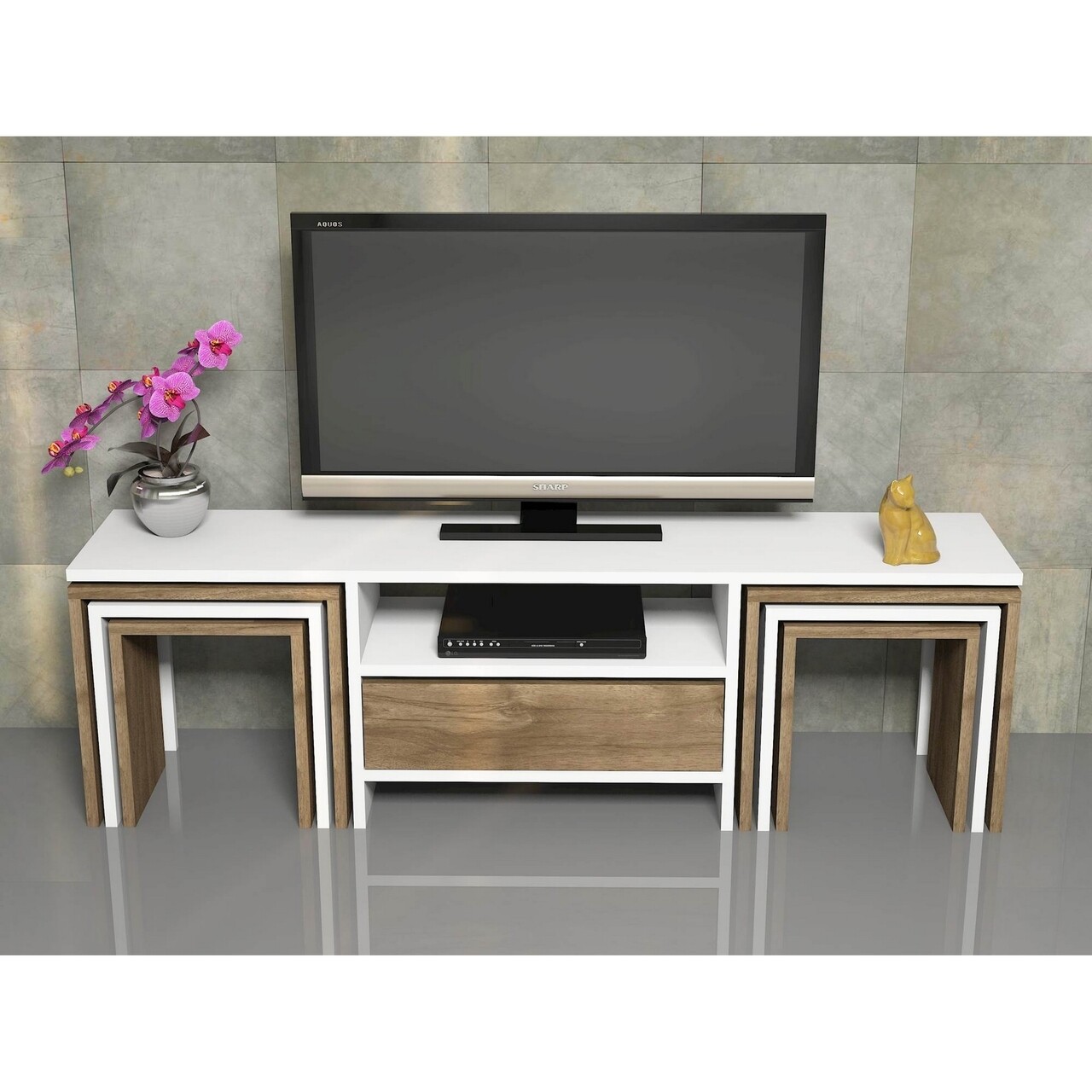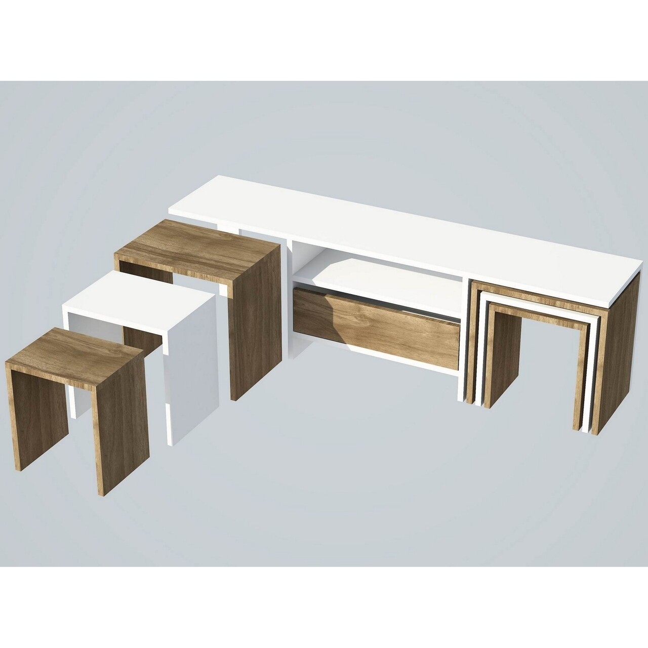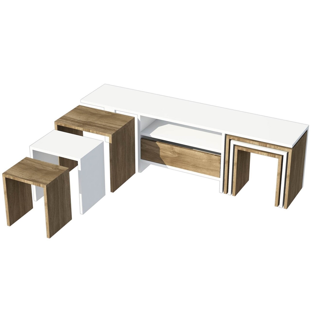 Comoda TV cu 6 masute Zygo, 140 x 30 x 41.8 cm/40 x 28 x 39 cm, alb/natural