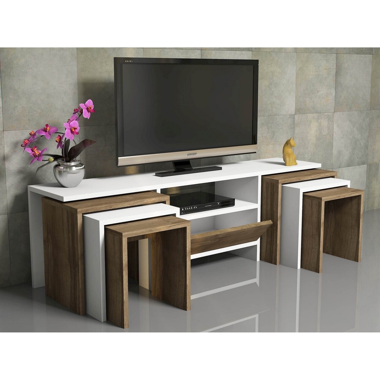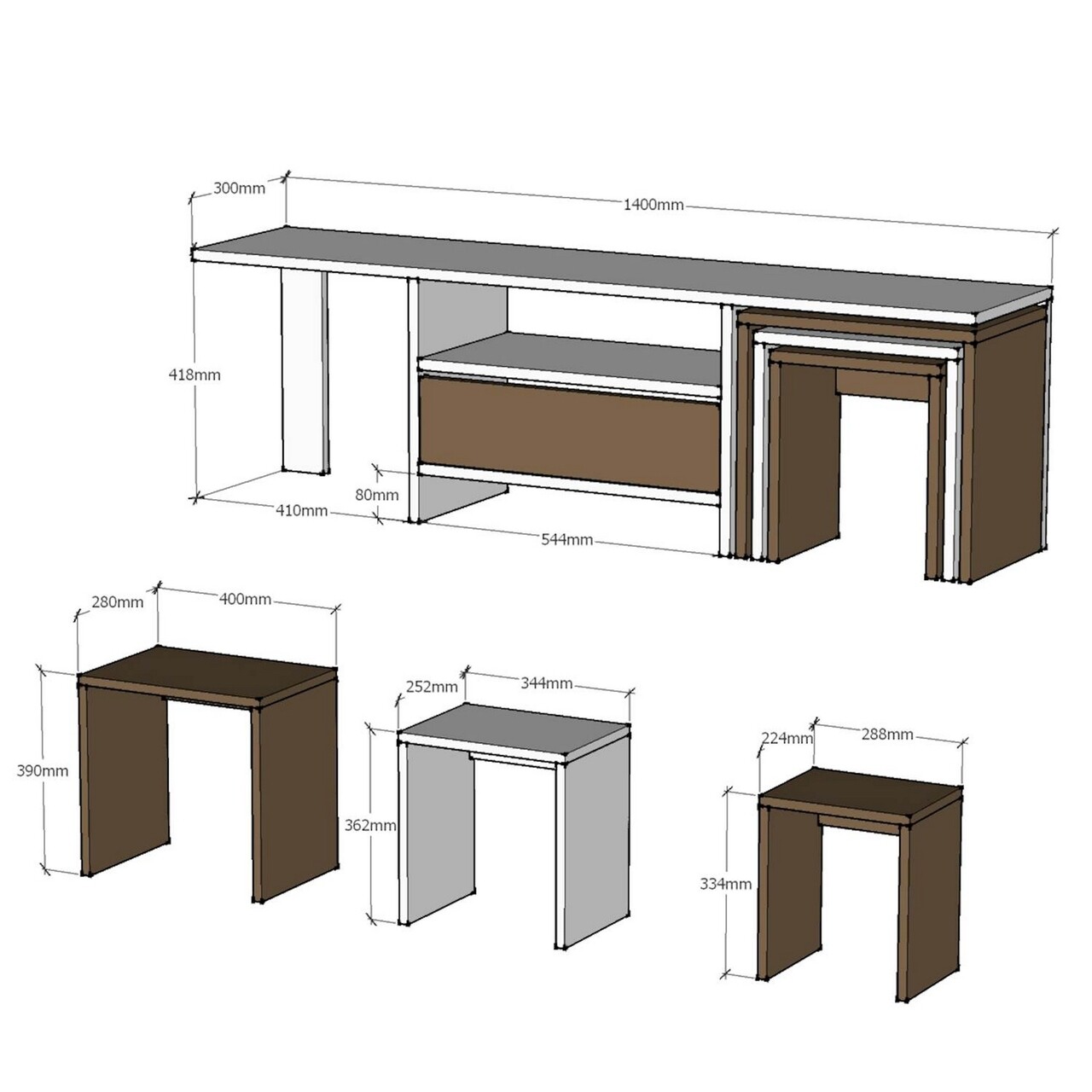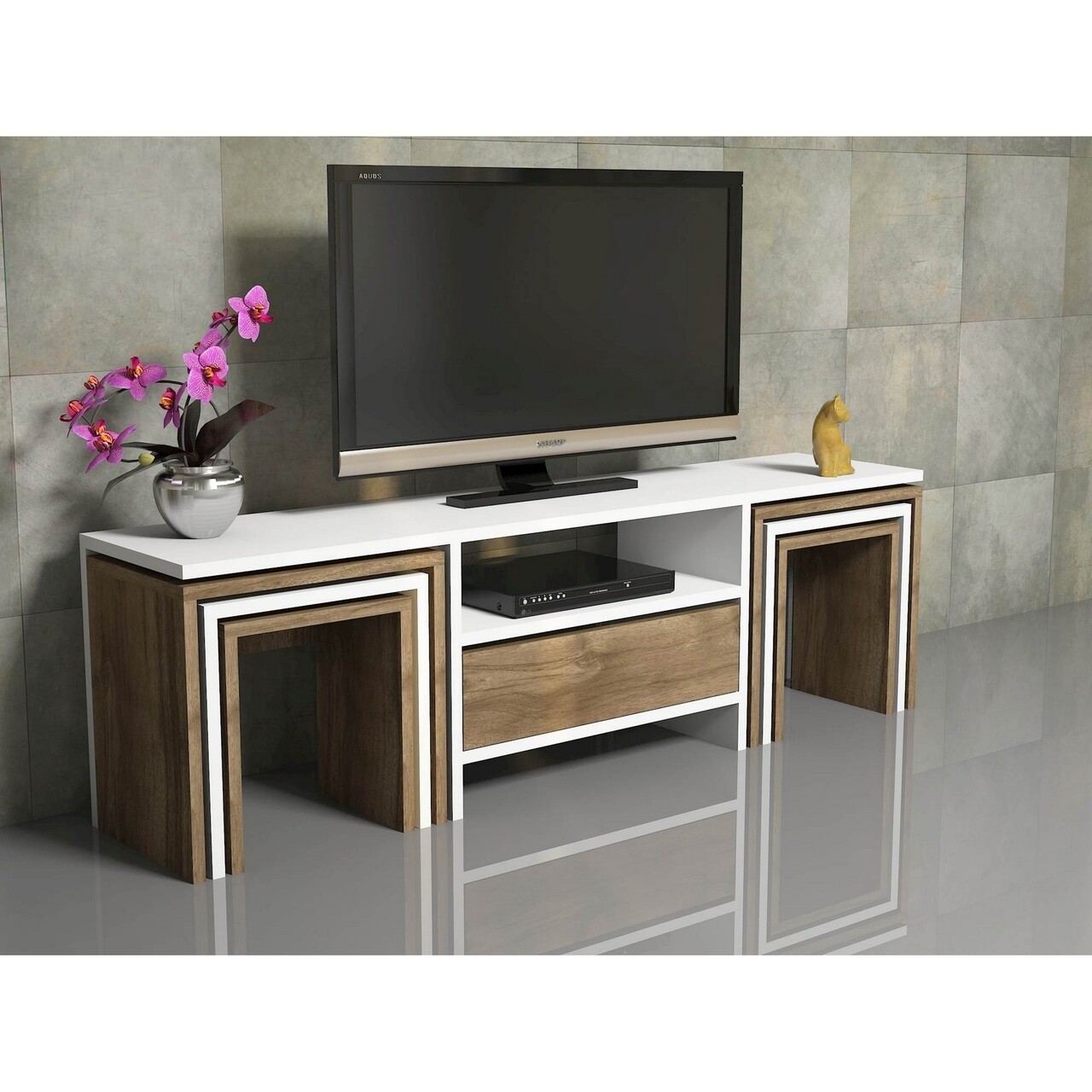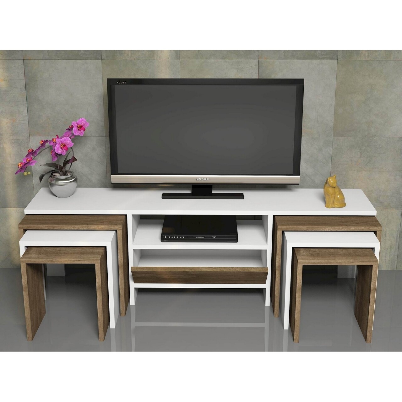 Comoda TV cu 6 masute Zygo, 140 x 30 x 41.8 cm/40 x 28 x 39 cm, alb/natural