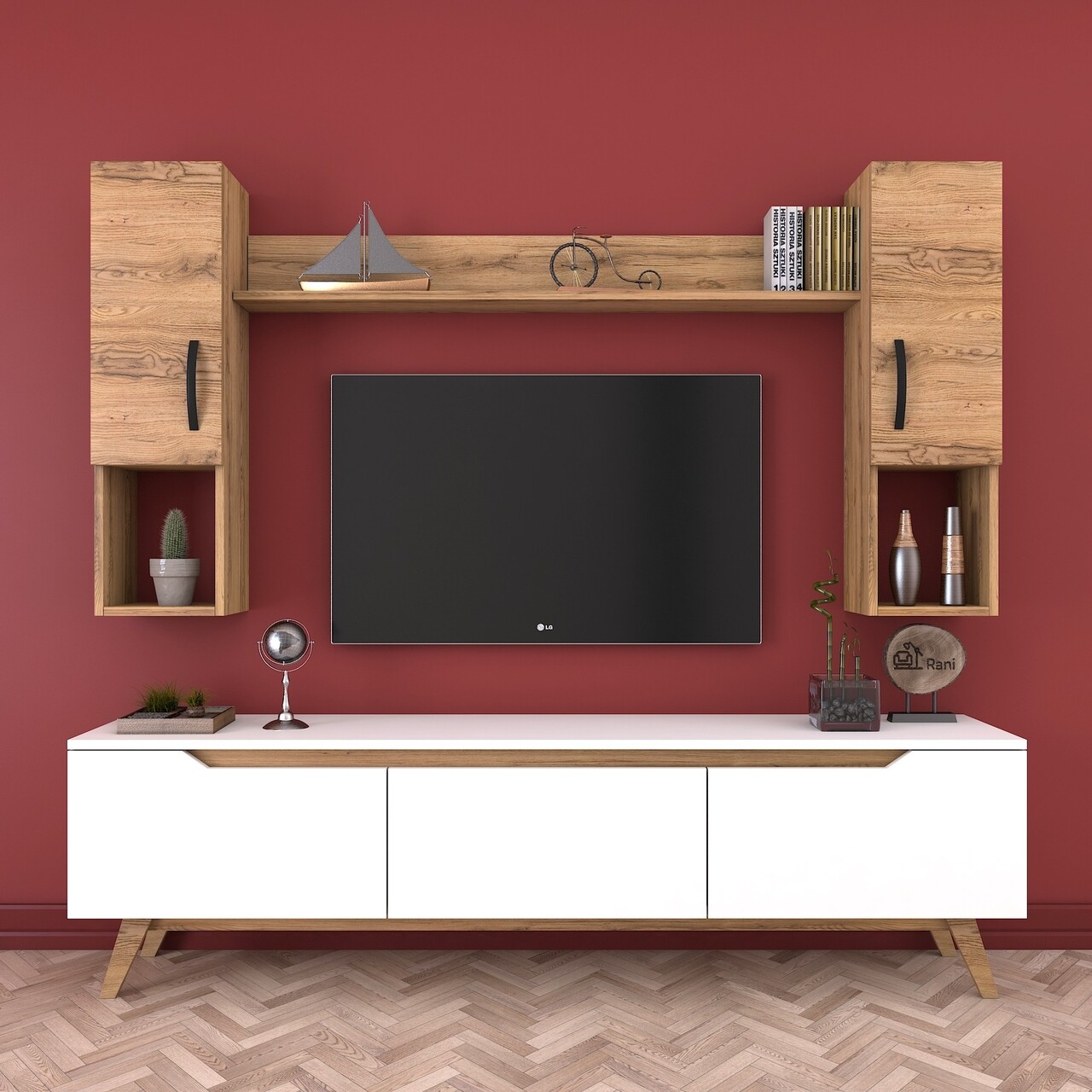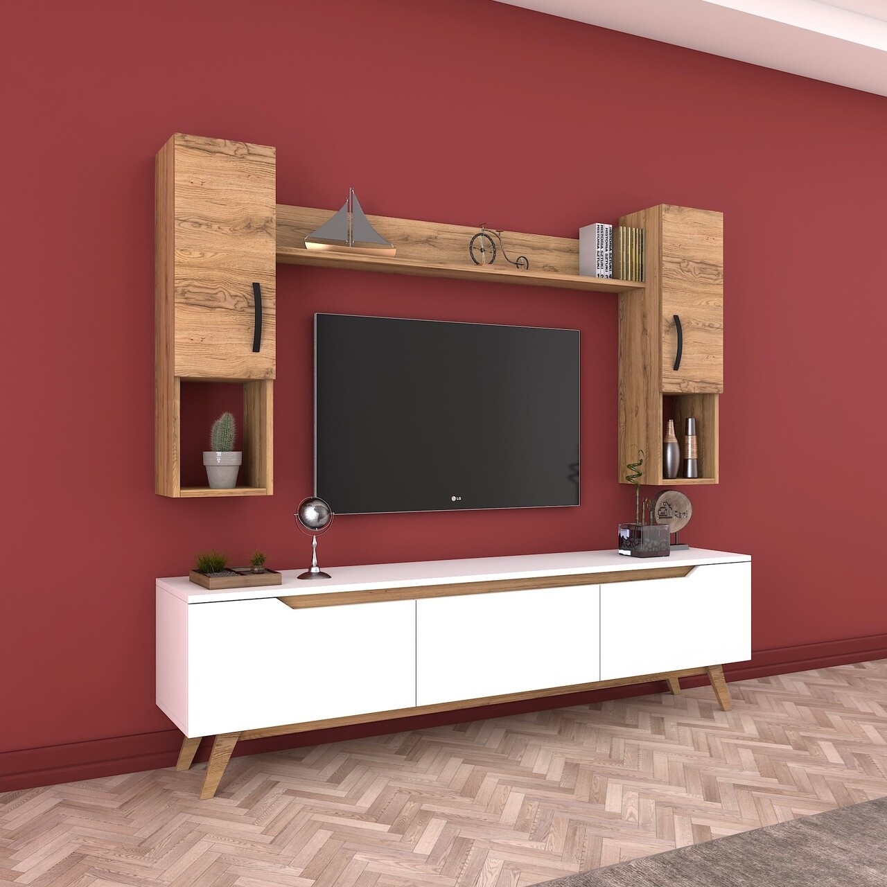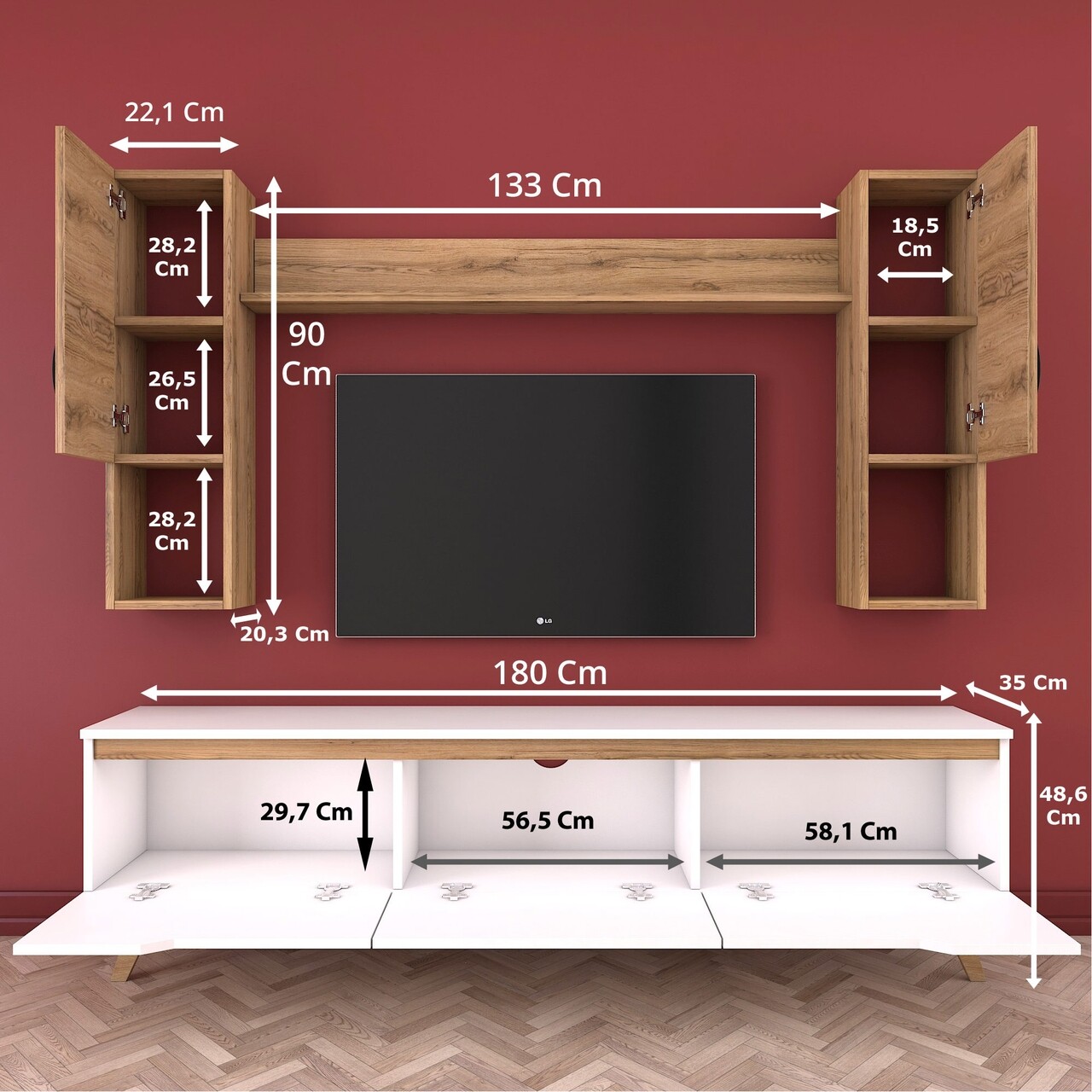 Comoda TV cu raft de perete si 2 cabinete M27 - 389, Wren, 180 x 35 x 48.6 cm/133 cm, white/walnut