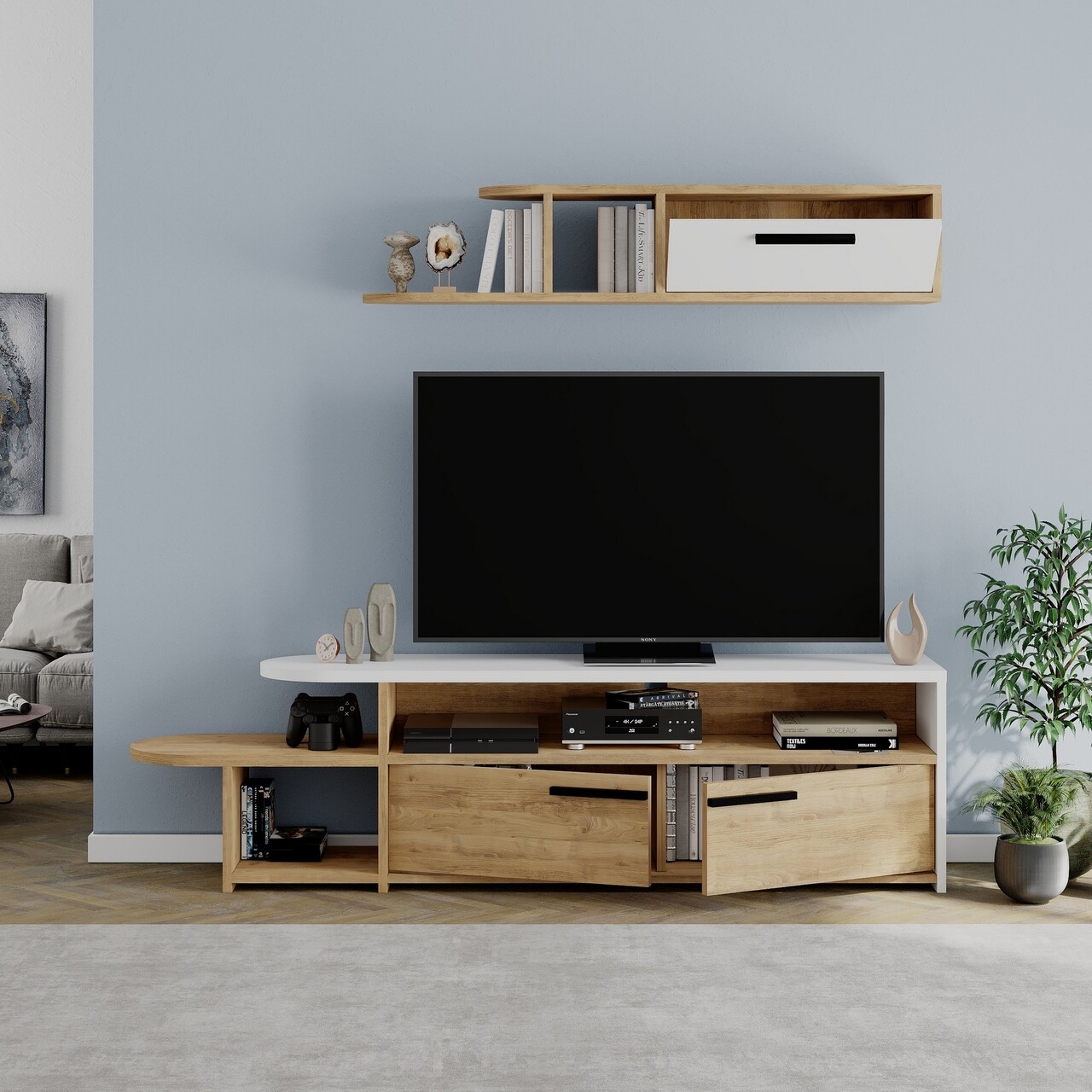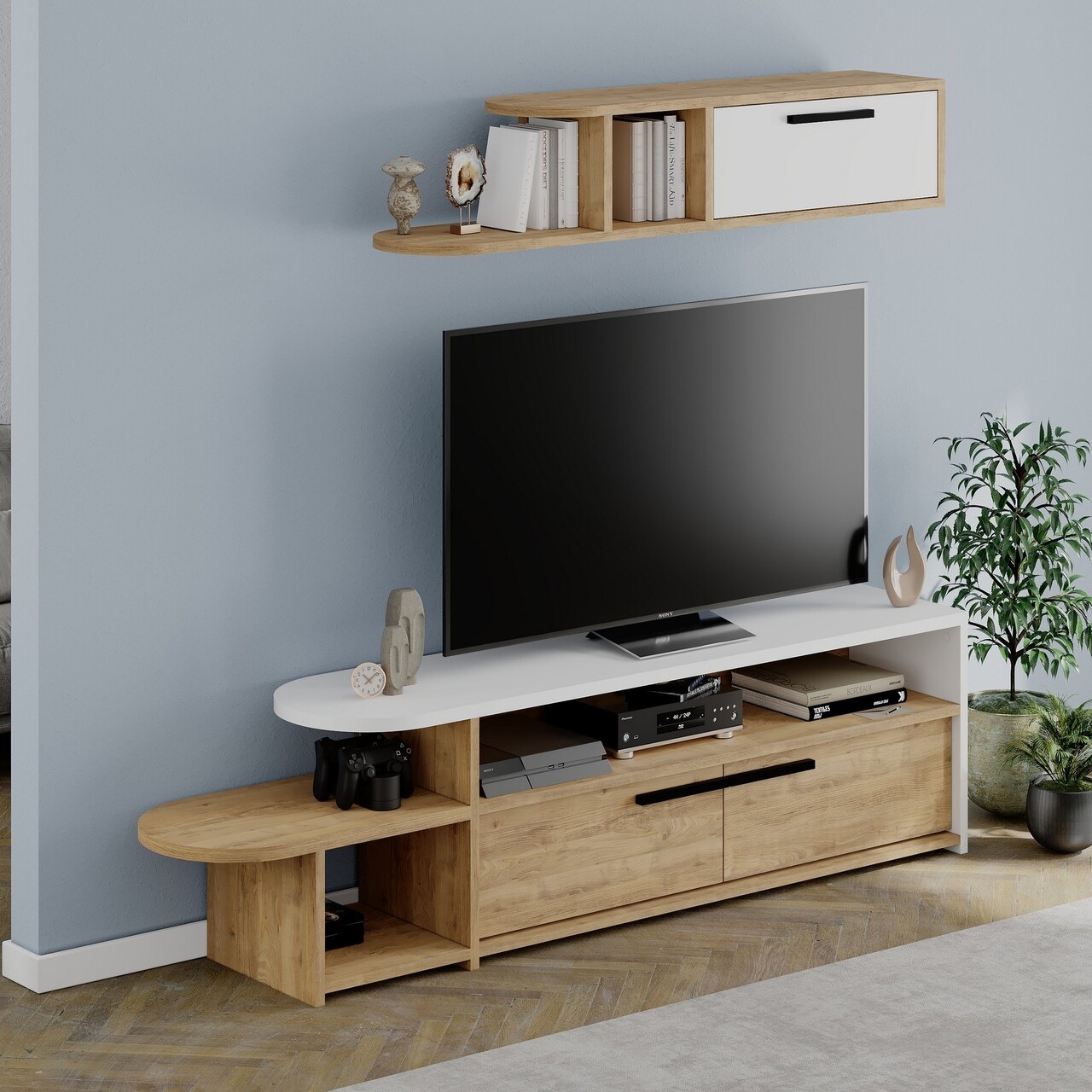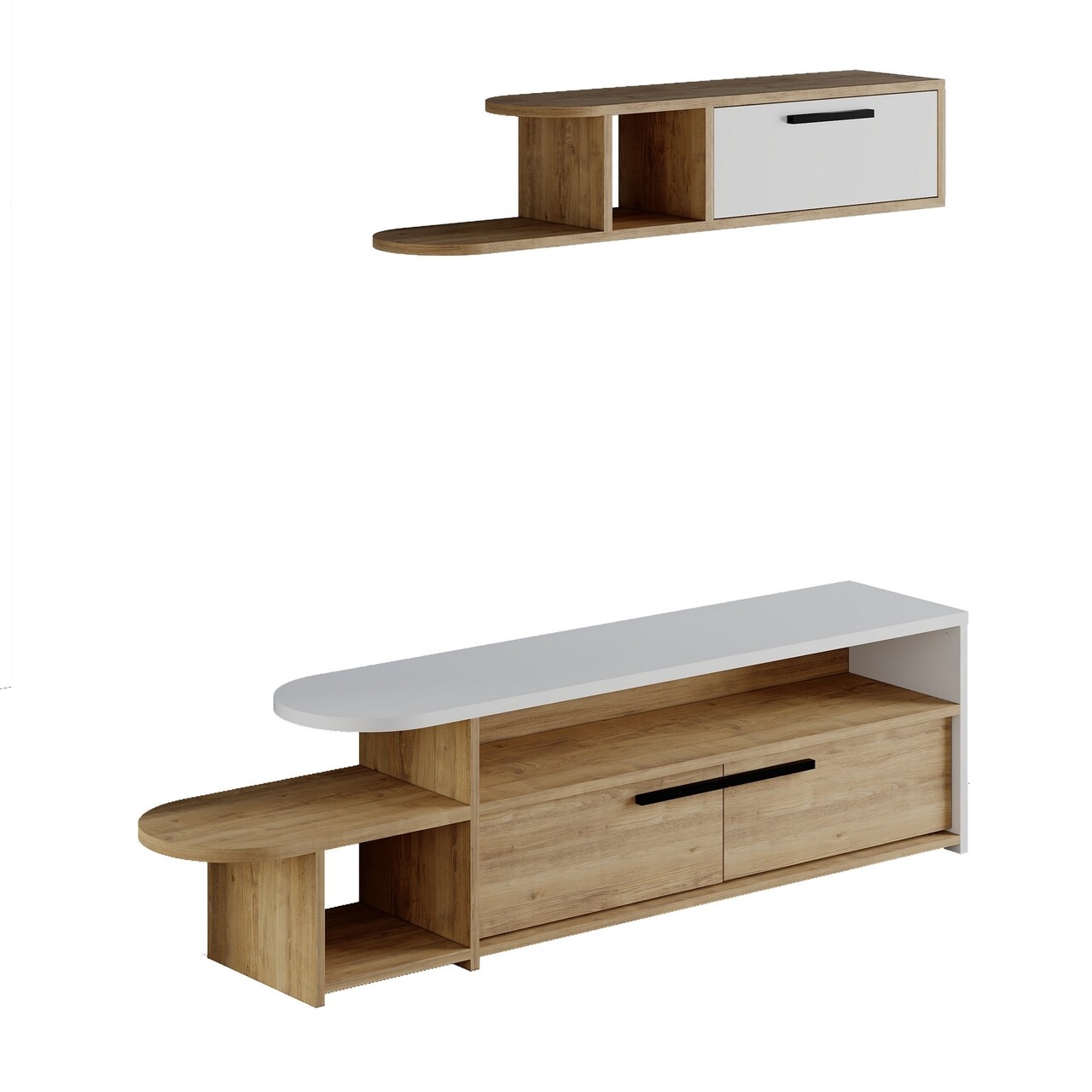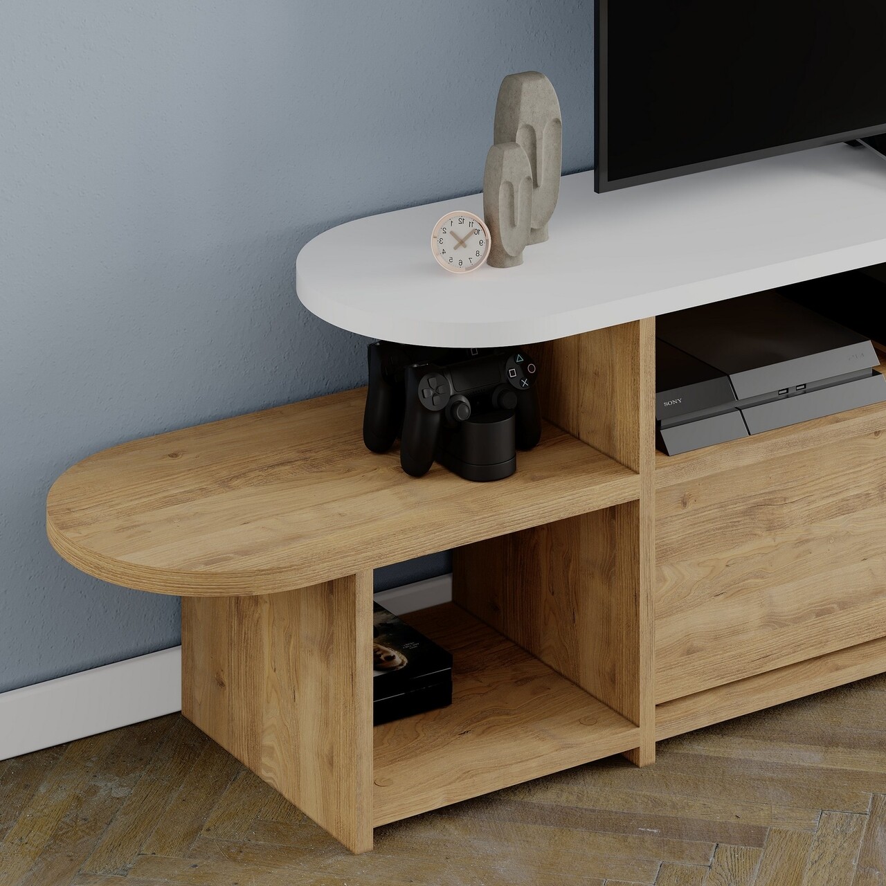 Comoda TV cu raft, Decortie, Lyra, 166.8 x 44.8 x 33 cm, pal melaminat, stejar/alb