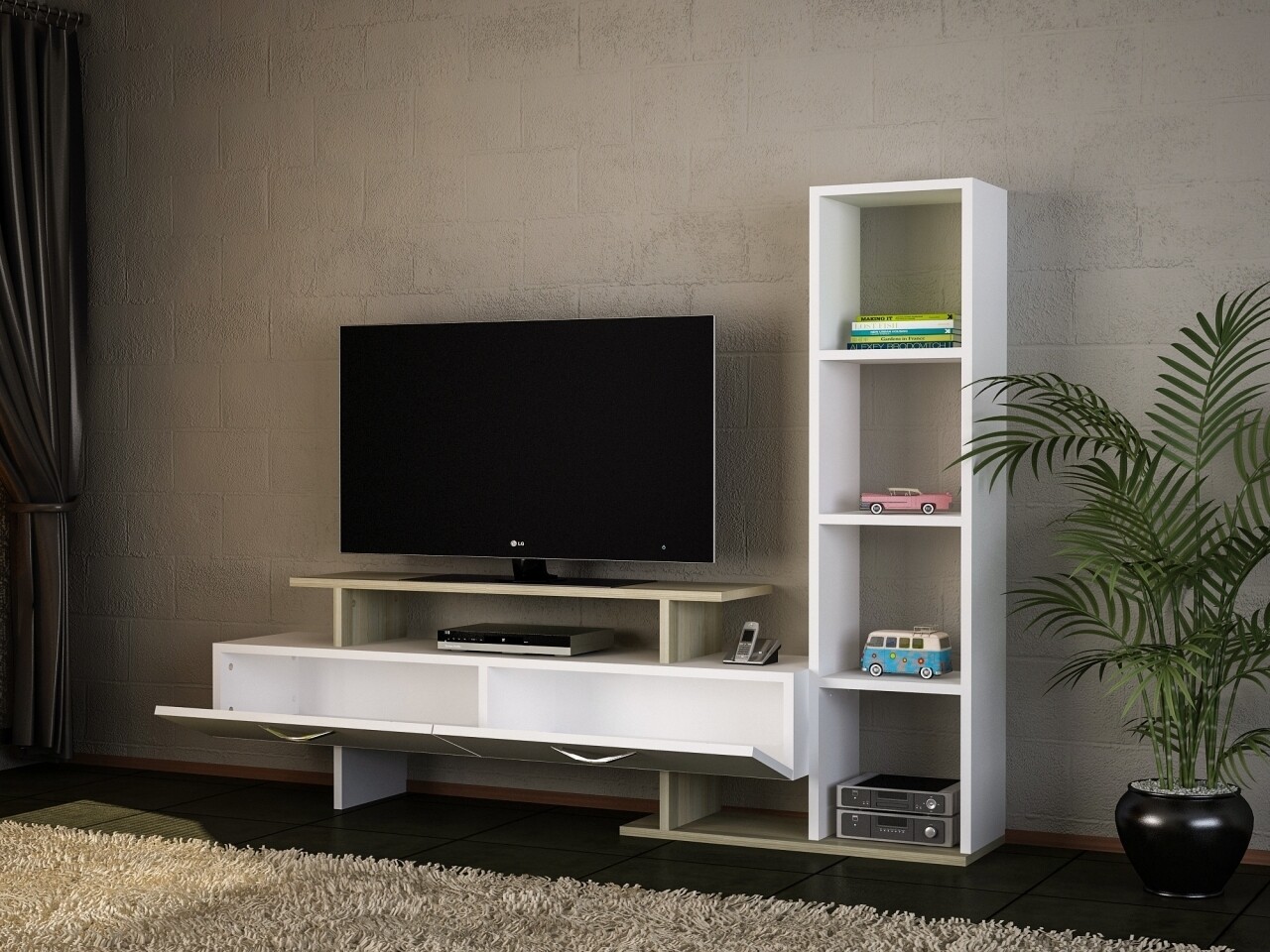 Comoda TV cu raft, Wooden Art, Minel White Cordoba, 148.6x121.8x29.5 cm