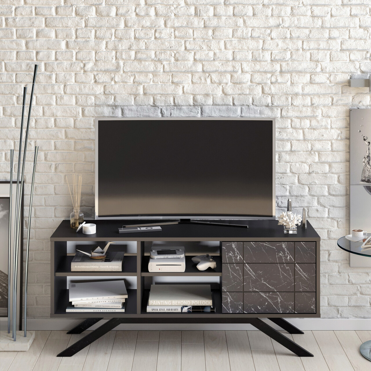 Comoda TV, Decorotika, North, 130x38 cm, PAL, Negru / Marmură
