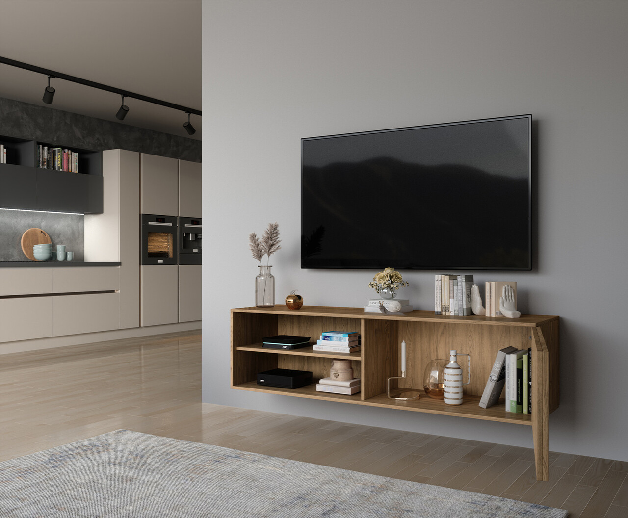 Comoda TV Entsian este o alegere excelenta pentru cei care cauta o solutie eleganta si practica pentru depozitarea dispozitivelor multimedia. Aceasta piesa de mobilier eleganta a fost proiectata avand in vedere functionalitatea, estetica si usurinta in utilizare. Dimensiunile optime permit amplasarea diferitelor dispozitive multimedia si a altor accesorii necesare in interiorul dulapului. Fabricata din placi de inalta calitate cu grosimea de 16 mm, comoda TV Entsian ofera nu numai o constructie solida, ci si durabilitate si rezistenta la deteriorare. Acest material a fost ales cu grija pentru a asigura o executie de inalta calitate si utilizarea pe termen lung a mobilierului. Comoda TV Entsian este disponibila in doua variante: cu picioare sau cu prindere in perete. Varianta cu picioare are doua rafturi inchise cu fronturi frezate. In plus, cele doua rafturi deschise permit depozitarea si expunerea convenabila a altor articole, cum ar fi decoratiuni sau carti. Cea de-a doua optiune, cu prindere in perete, este prevazuta cu un raft inchis cu fronturi frezate si doua rafturi deschise. Aceste detalii speciale adauga eleganta si un caracter unic, creand un accent elegant in camera. Cu designul sau functional si manopera de inalta calitate, comoda TV Entsian este o solutie excelenta pentru depozitarea dispozitivelor multimedia intr-un mod elegant si practic. Nu numai ca ofera spatiu adecvat, dar adauga si finisaje estetice care imbunatatesc orice interior.