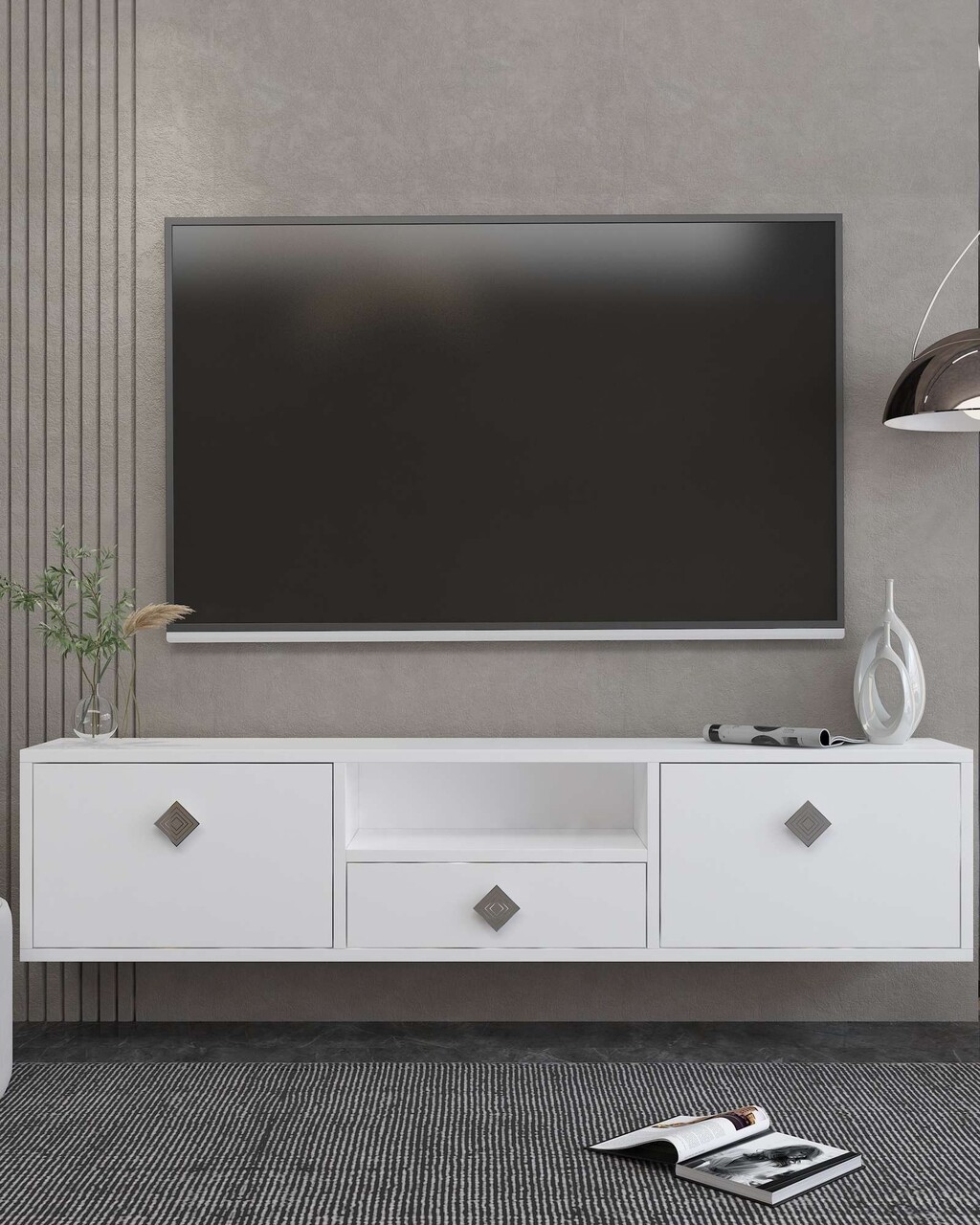 Comoda TV, Hanah Home, 1305-DROP-1, 140x30x30 cm, PAL , Alb / Argintiu