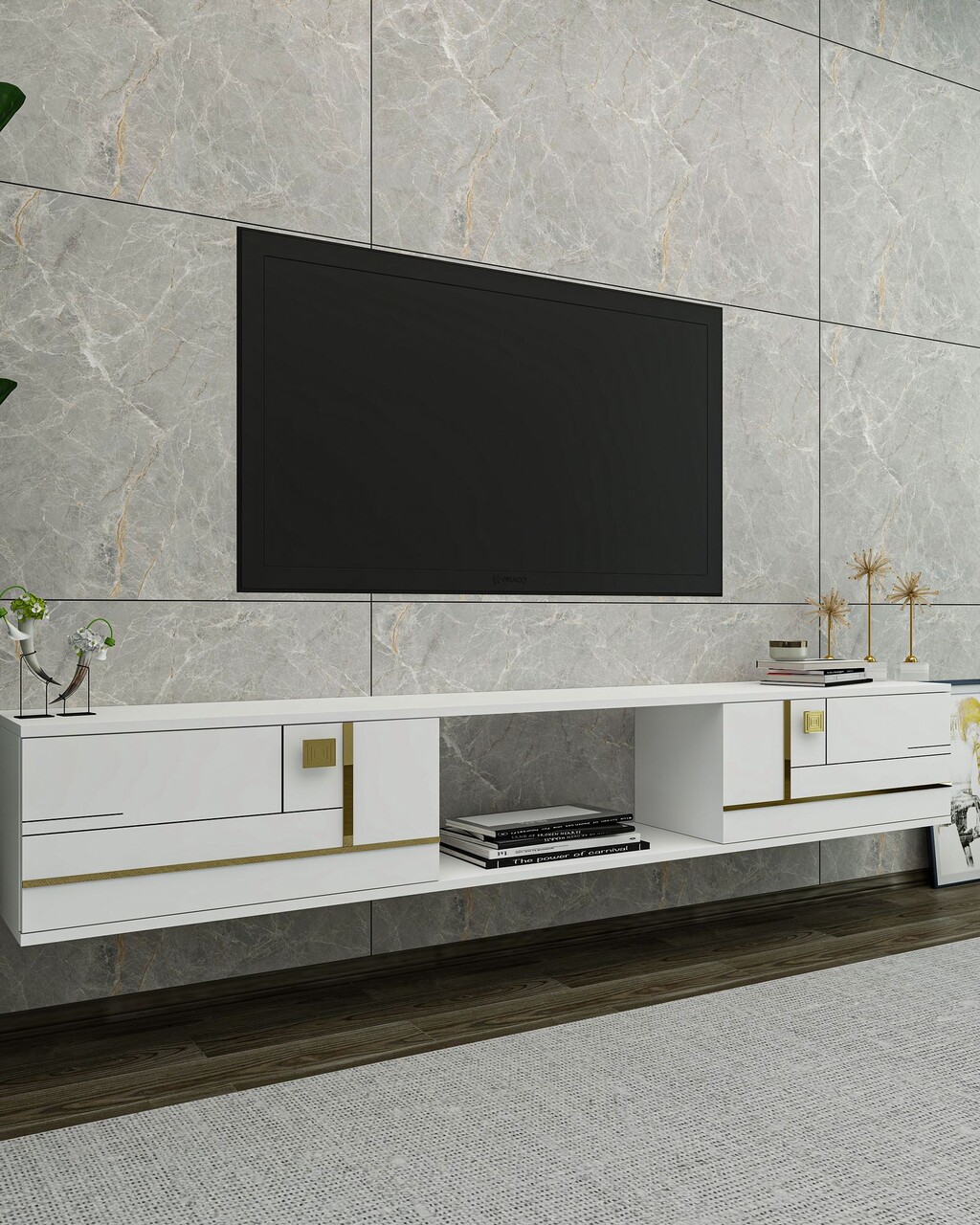 Comoda TV, Olivia, Aredam, 150x25 cm, PAL , Alb/Auriu