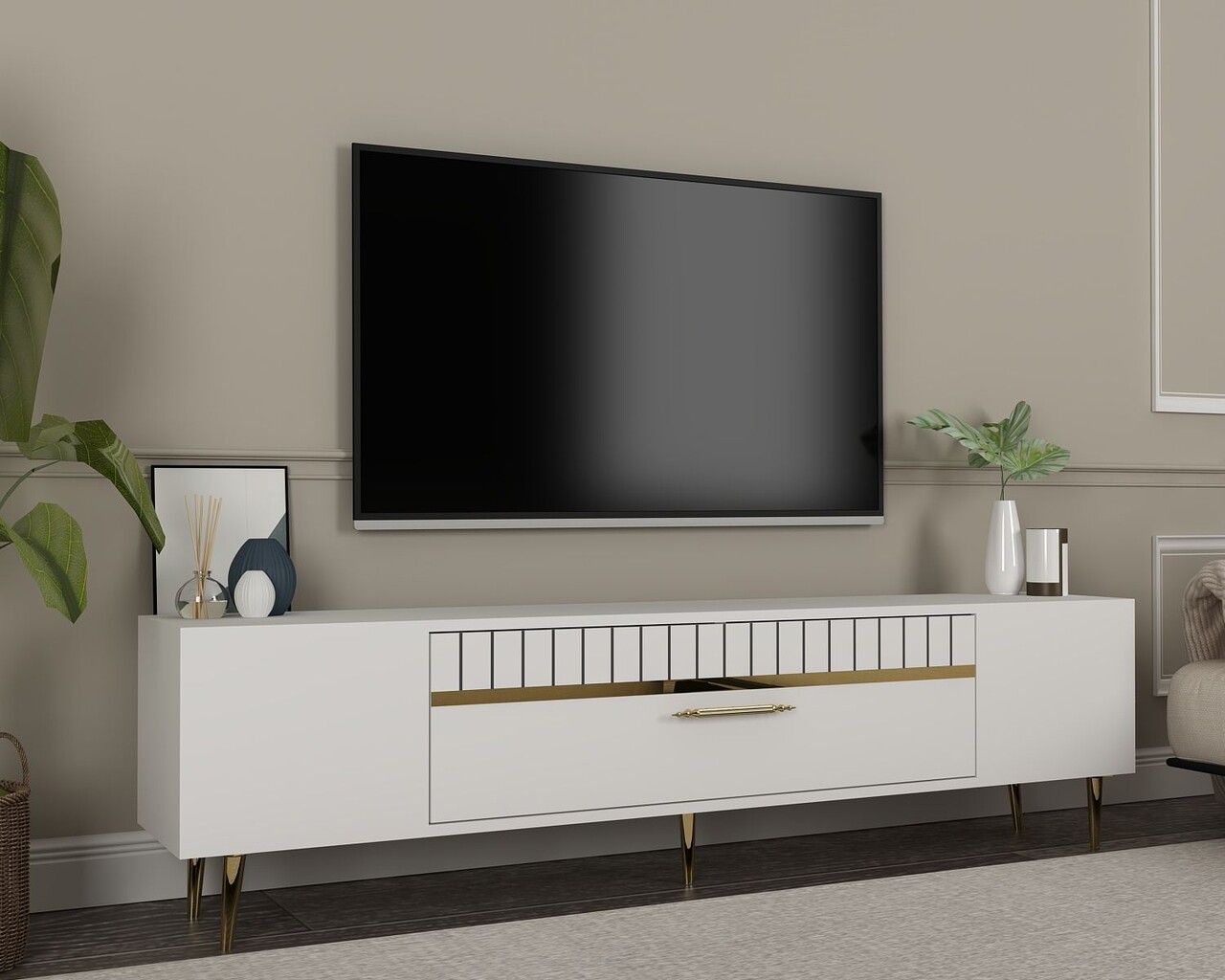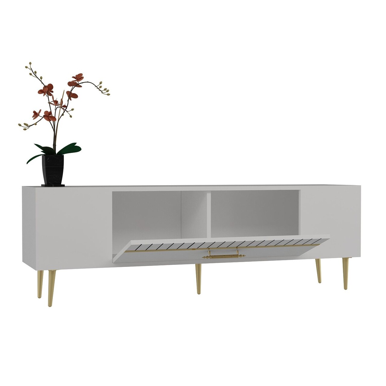 Comoda TV, Olivia, Dekolp1, 150x48x29 cm, PAL, Alb/Auriu