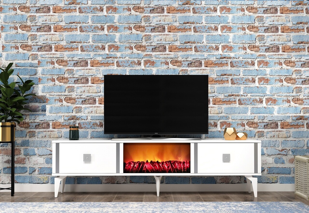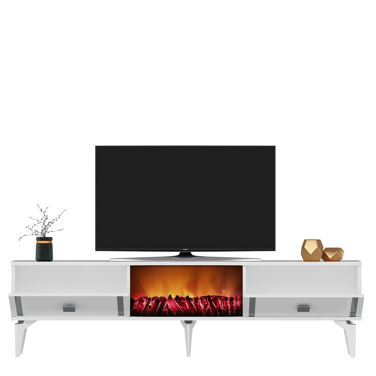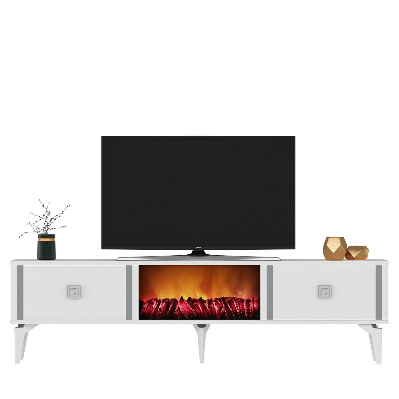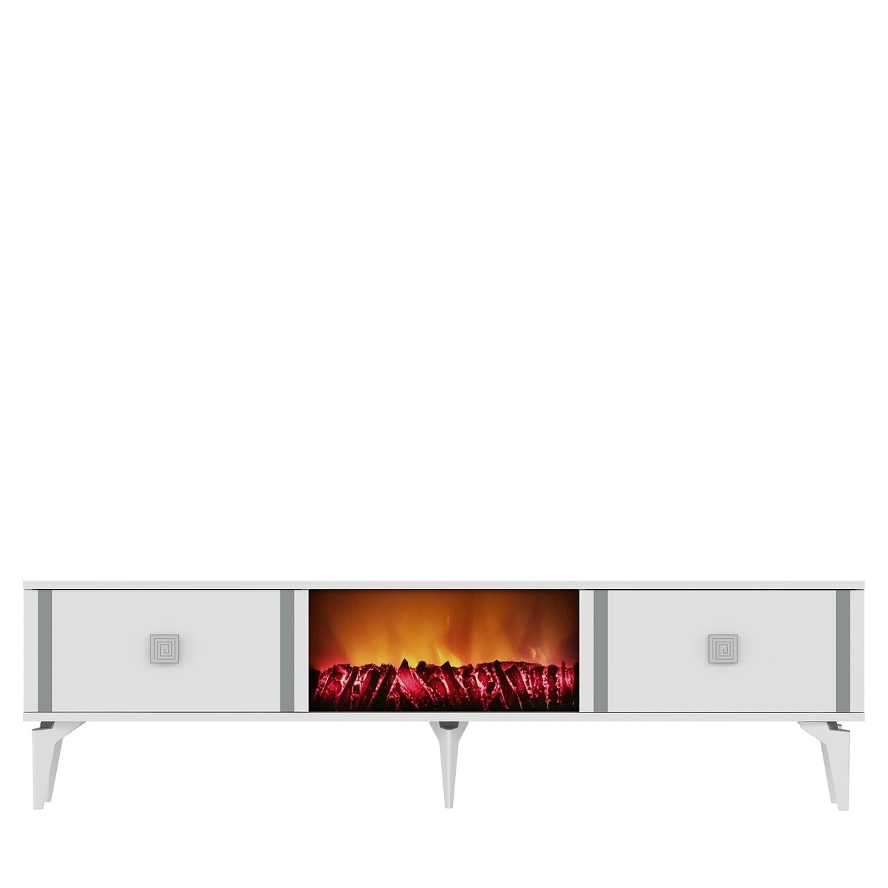 Comoda TV, Olivia, Doruk Fireplace, 150x44.6x29.6 cm, PAL , Alb / Argintiu