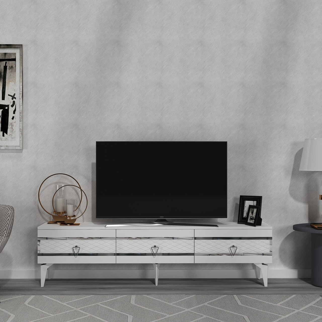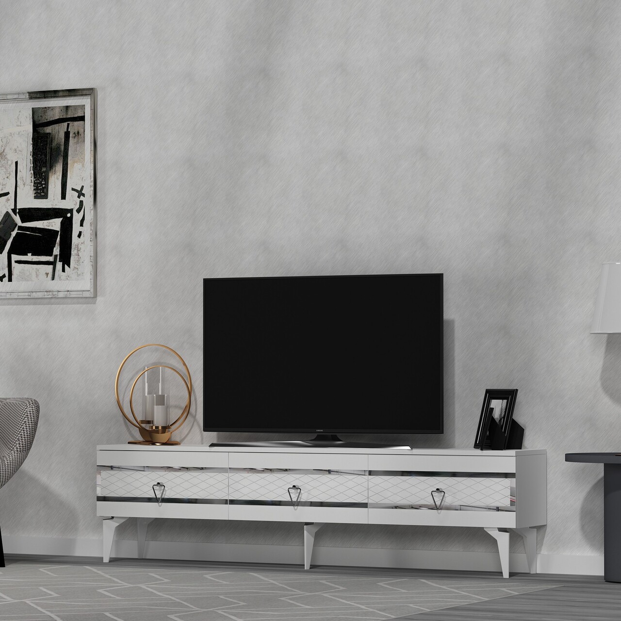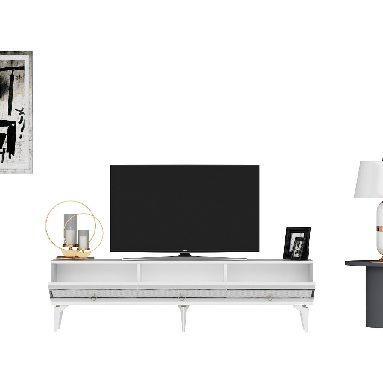 Comoda TV, Olivia, Ipek, 180x44.6x29.6 cm, PAL , Alb / Argintiu