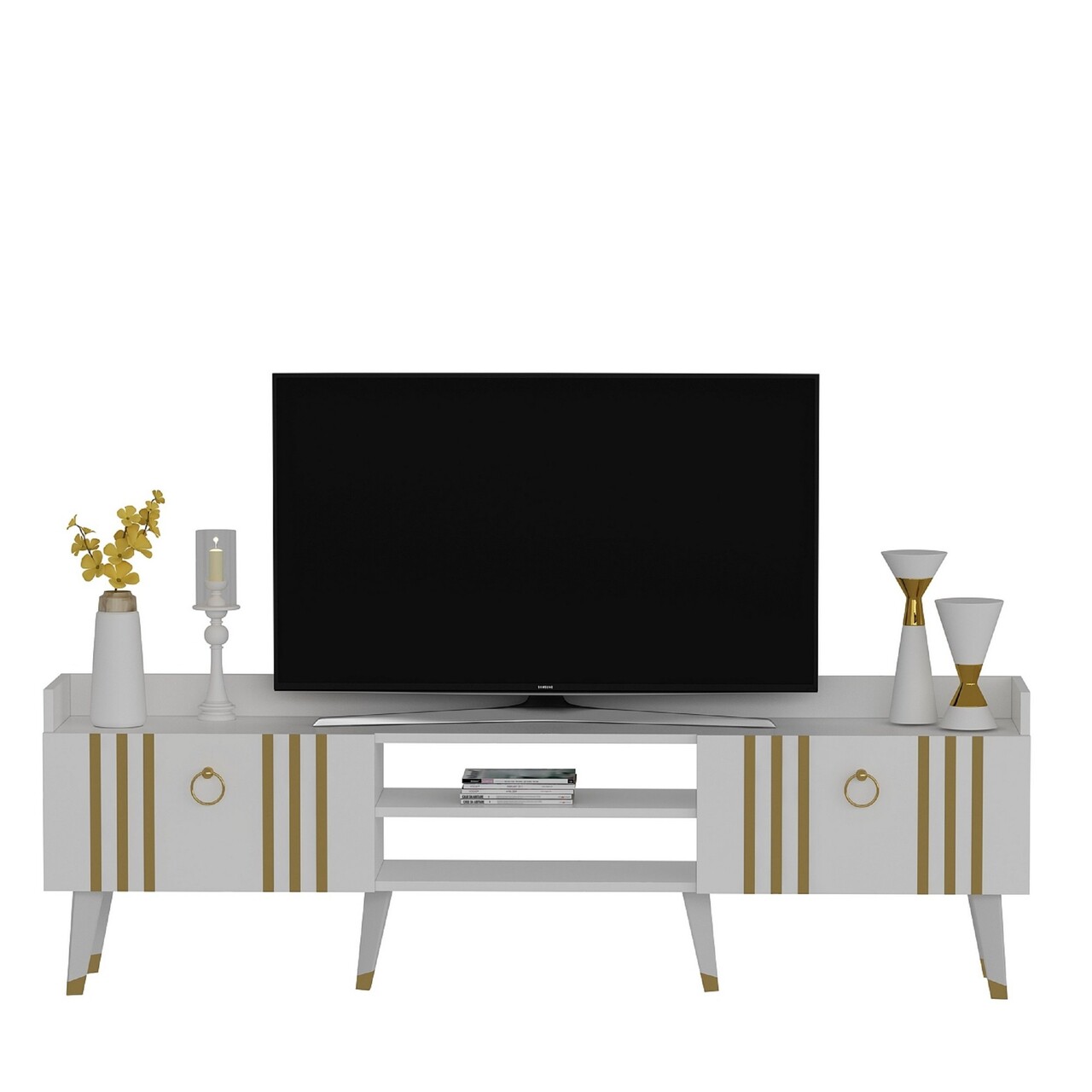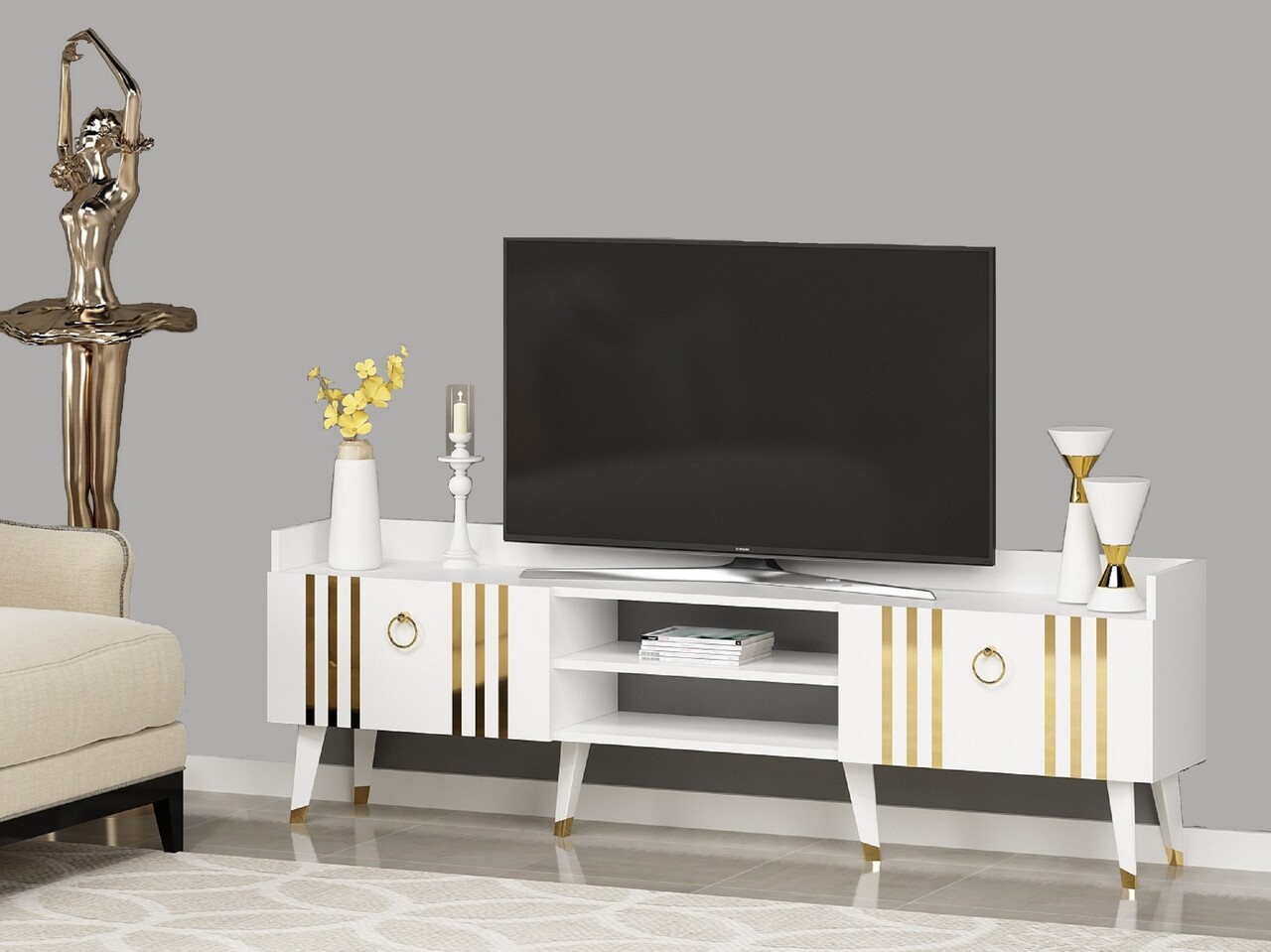 Comoda TV, Olivia, Isıl, 183.6x29.6x57.6 cm, PAL , Alb/Auriu