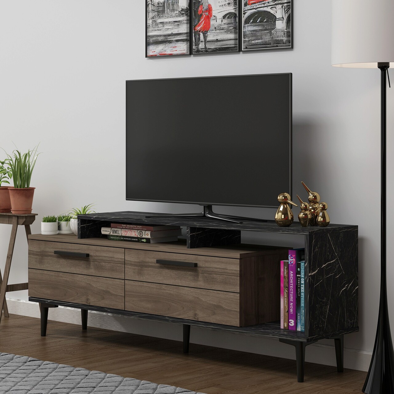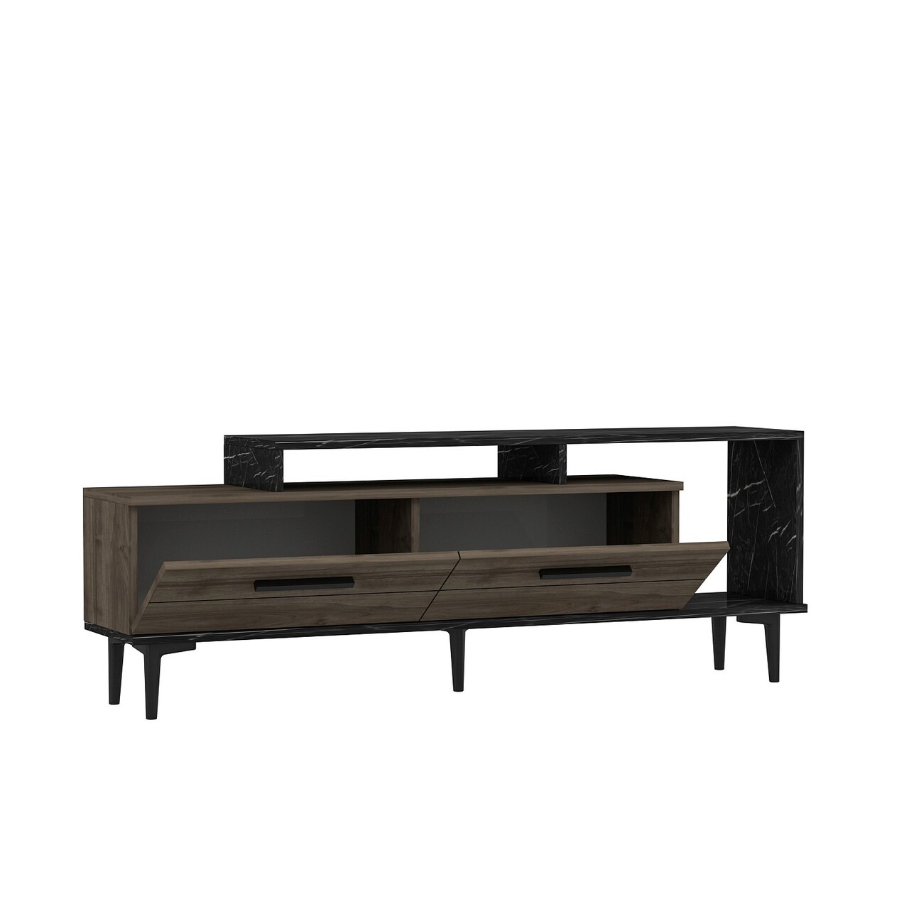 Comoda TV, Olivia, Niva, 150x54x31.4 cm, PAL, Nuc / Marmură Neagră