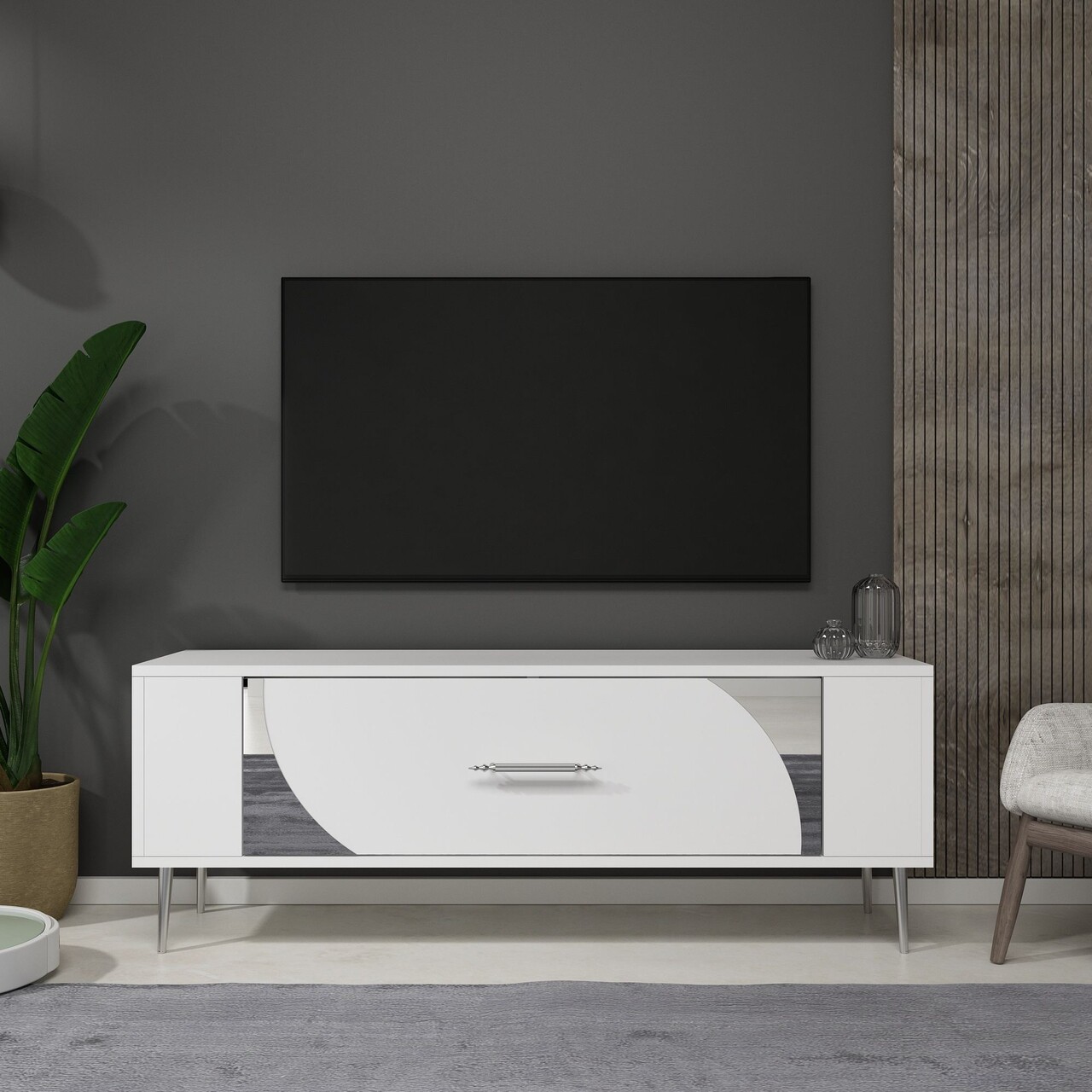 Comoda TV, Olivia, Retrop2, 120x48 cm, PAL, Alb / Argintiu