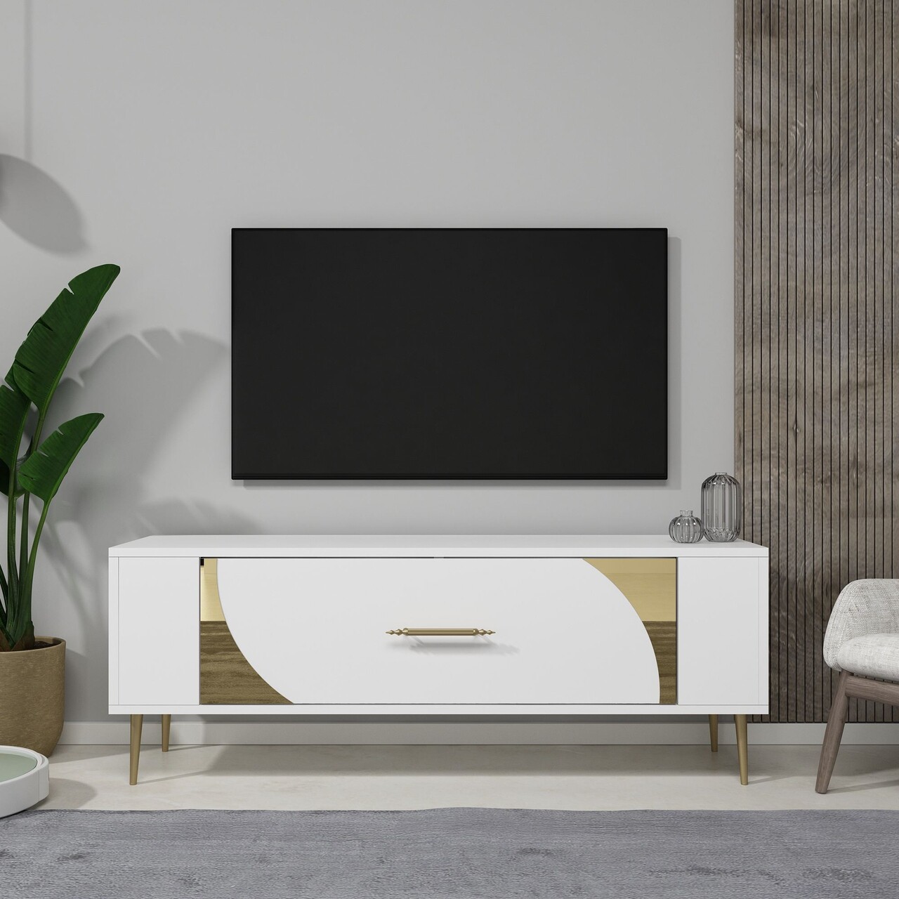 Comoda TV, Olivia, Retrop2, 120x48 cm, PAL, Alb/Auriu