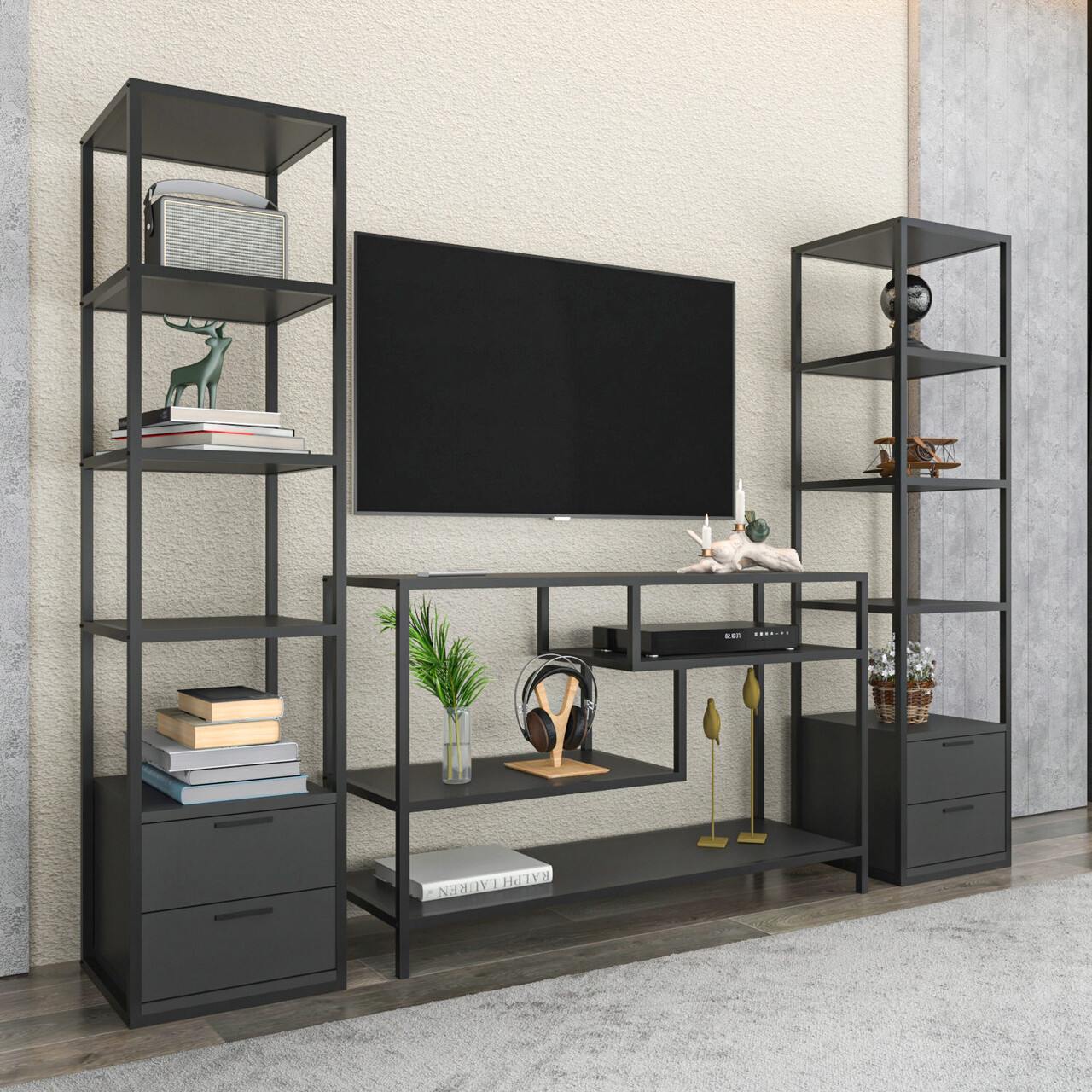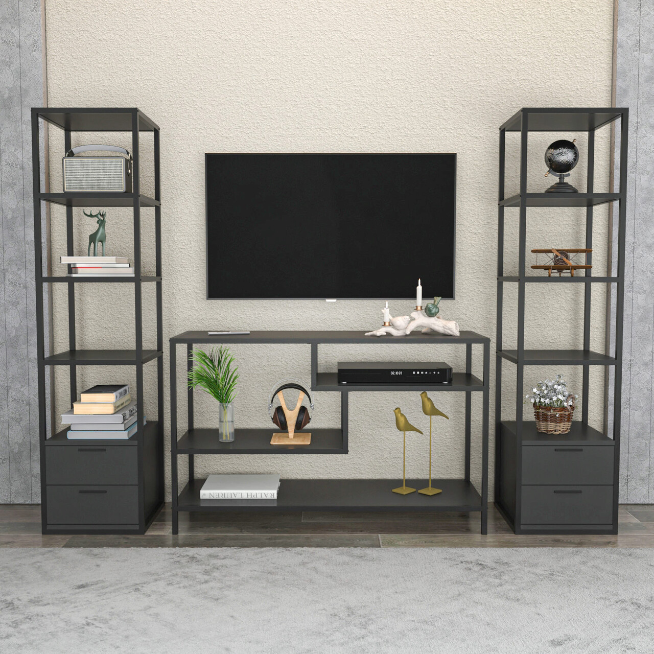 Comoda TV, Retricy, Robbins, 198x39x160 cm, PAL, Negru / Antracit