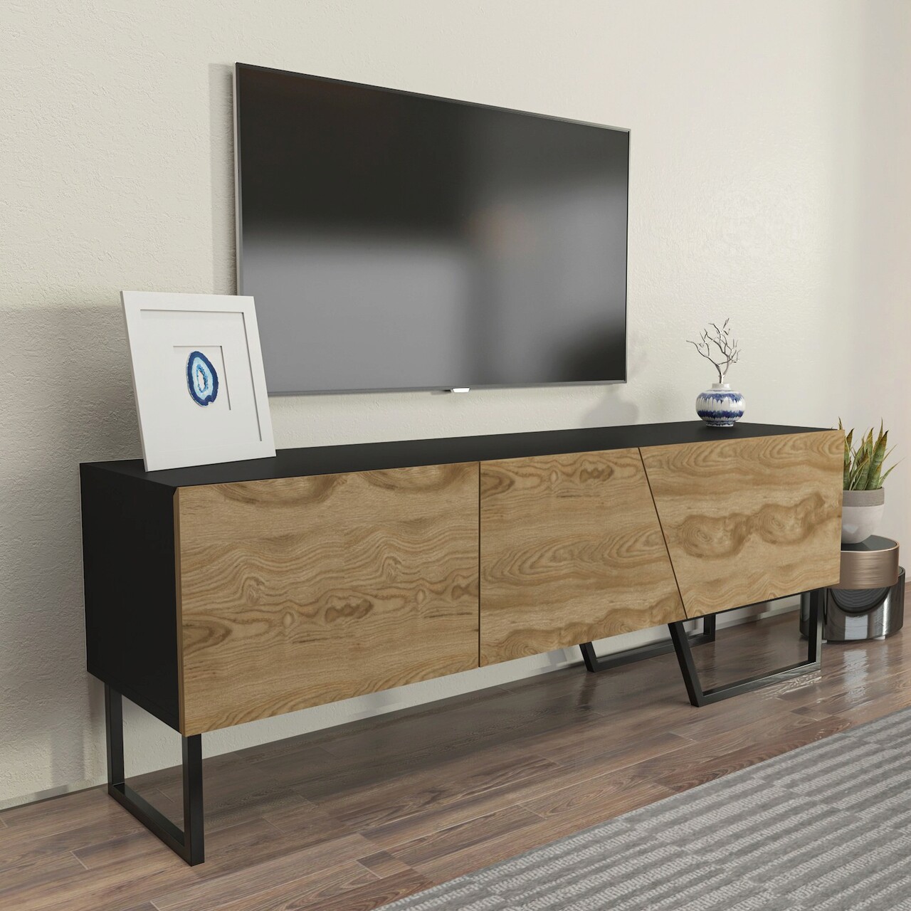 Comoda TV, Zena Home, Parla, 150x50.6x35 cm, PAL, Negru / Stejar