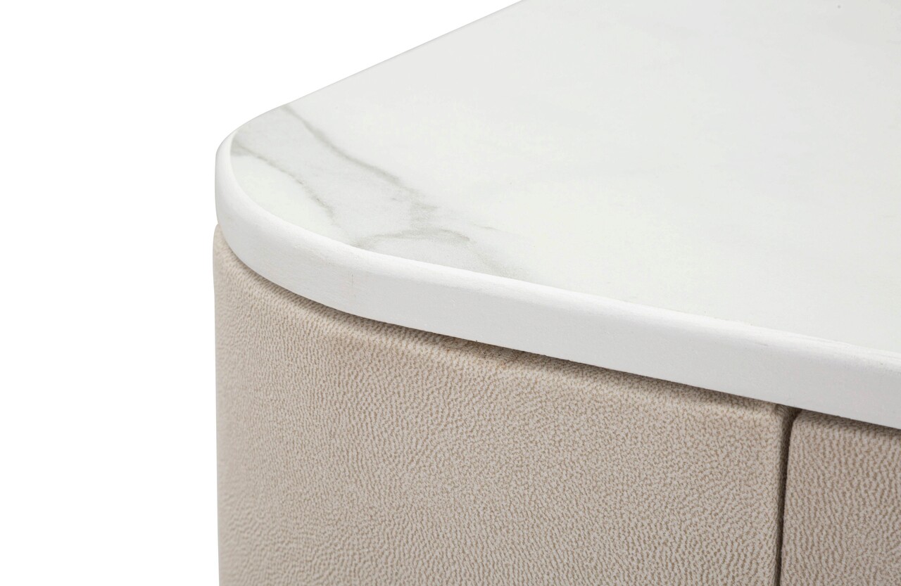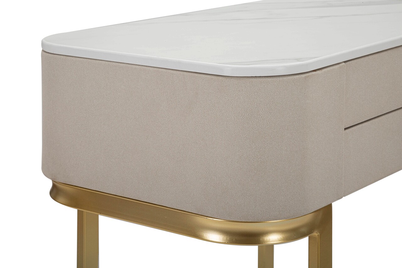 Consola acoperita cu tesatura alba, cu blat asemanator marmurei, prevazuta cu 2 sertare. Manerele, picioarele si ornamentele aurii ii dau o nota de eleganta. Compozitie material: lemn de pin, MDF, metal, invelis textil.