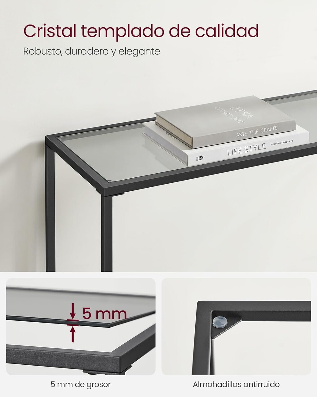 Suport stabil: Blatul din sticla de 5 mm este sustinut de un cadru metalic solid. Masa de 20 x 100 x 80 cm poate sustine pana la 30 kg – ideal pentru plante, decoratiuni, carti sau obiecte decorative.