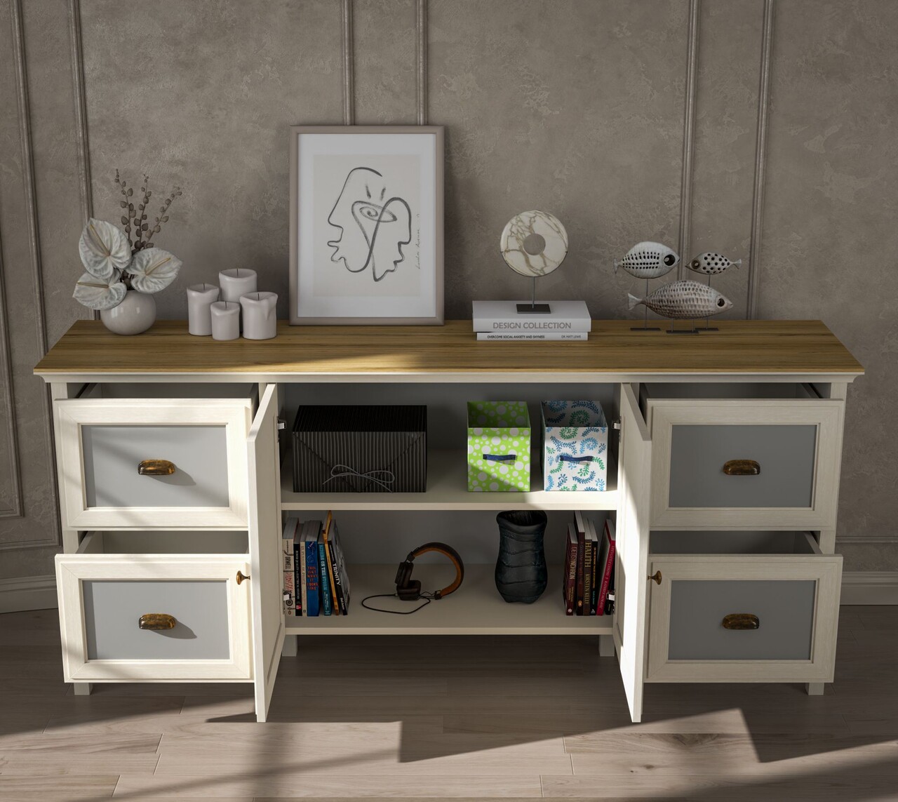 Consola, Hanah Home, FRN-21010, 184.8x82x44 cm, PAL, Crem / Stejar / Gri