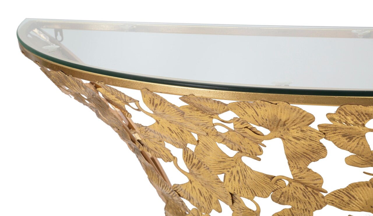 Consola de perete semicirculara din metal aurit cu blat de sticla. Baza este bogat decorata cu frunze. Designul deosebit confera o nota de clasa si relaxare oricarei incaperi.