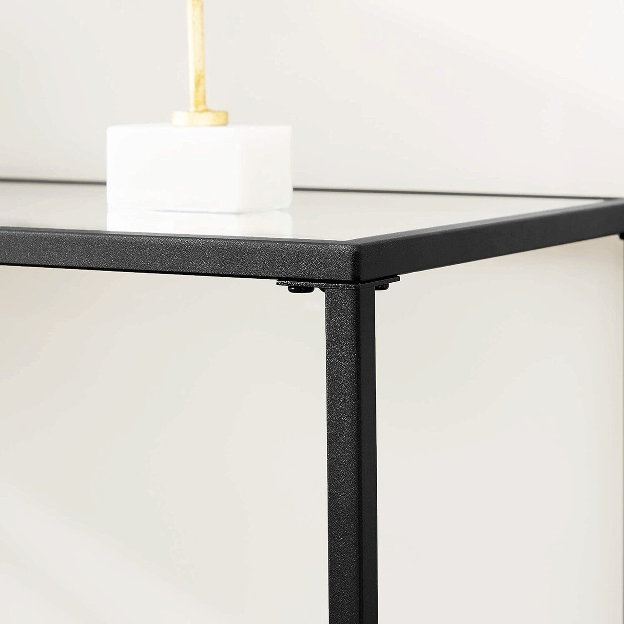 Sustinere transparenta: Blatul de sticla securizata de 6 mm este fixat pe cadrul metalic al mesei de 35 x 100 x 80 cm (A x L x H), oferind suport solid pentru pana la 30 kg – plante, decoratiuni, carti sau suveniruri.