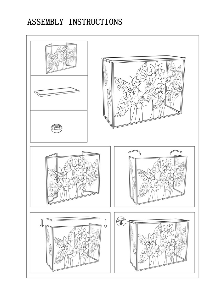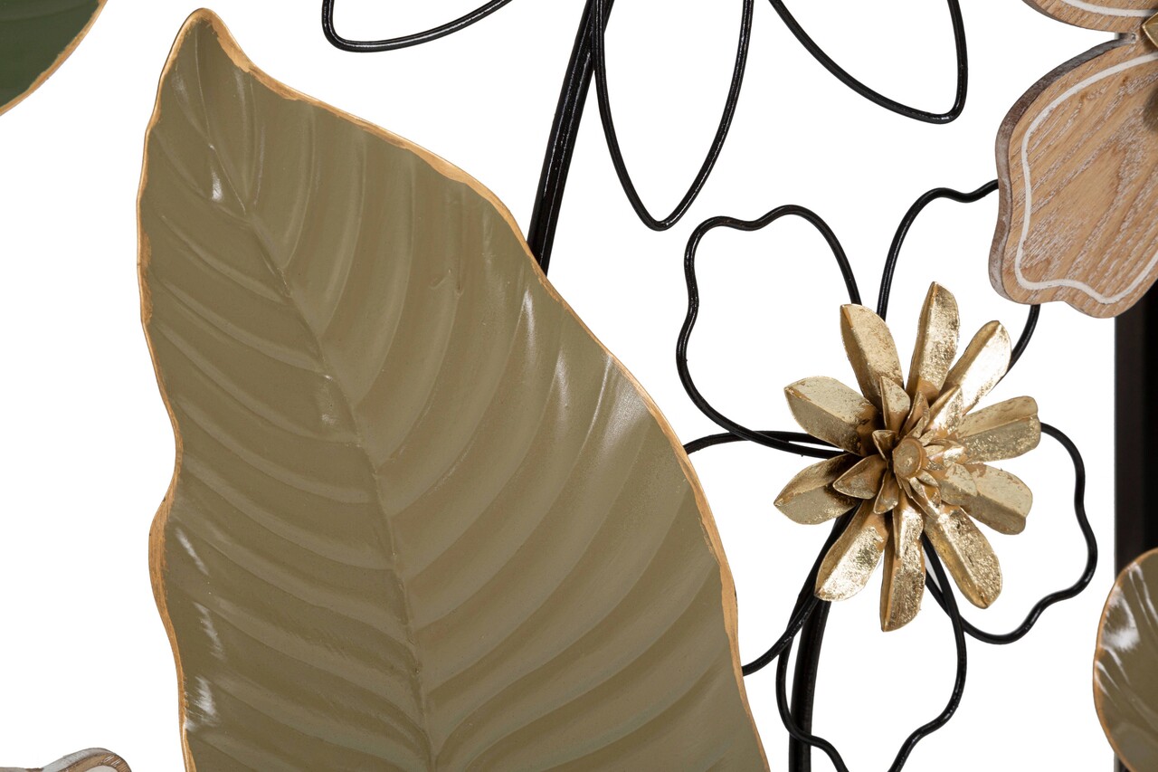 Consola dreptunghiulara din fier negru cu frunze si flori decorative si blat din MDF maro.