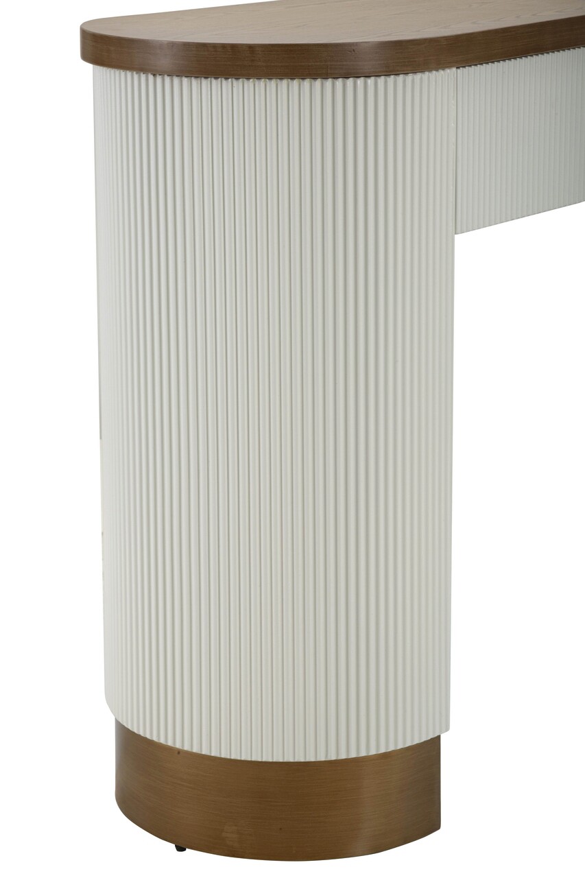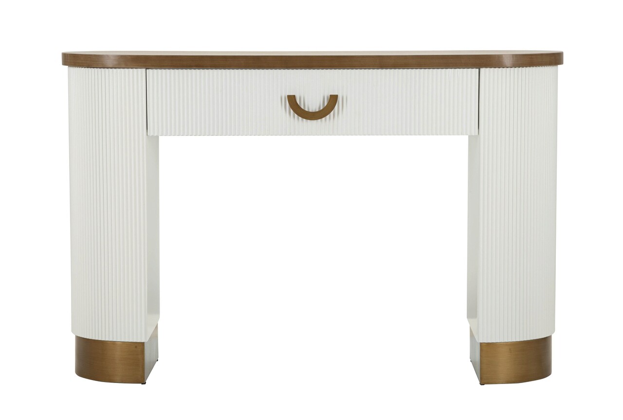 Consola din lemn alb, cu blat si insertii din lemn maro, cu design rotunjit. Decorata fin cu linii in relief. Prevazuta cu sertar. Compozitie material: MDF, lemn de frasin, fier. Dimensiuni interioare sertar: 71x28x12 cm.