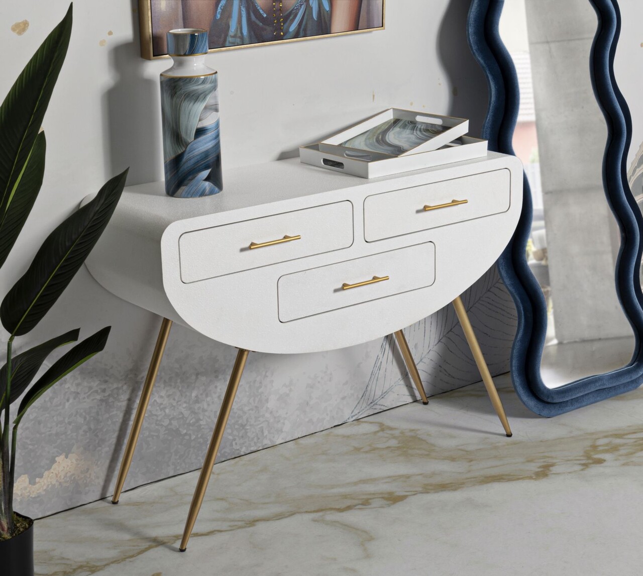Consola din lemn alb, cu linii rotunjite ce amintesc de piesele moderne de antichitate din anii ’70. Prevazuta cu 3 sertare. Picioare din metal auriu, de asamblat. Dimensiuni interioare sertar: 44x28x18 cm.
