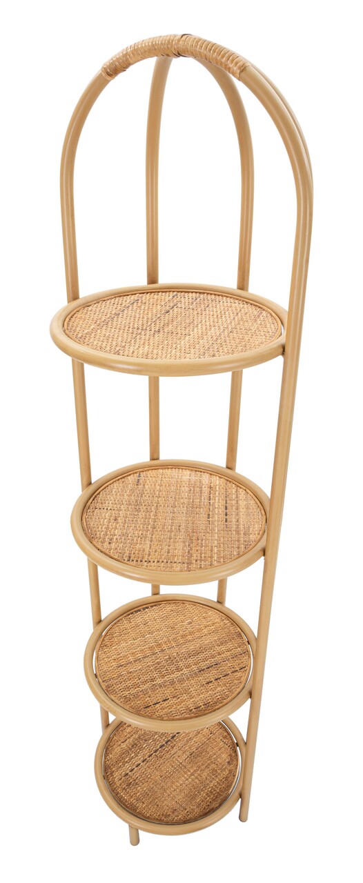 Biblioteca din metal cu finisaj din ratan, rotunda, cu 4 rafturi. Designul rotunjit si liniile simple o fac o completare perfecta pentru orice tip de mobilier.