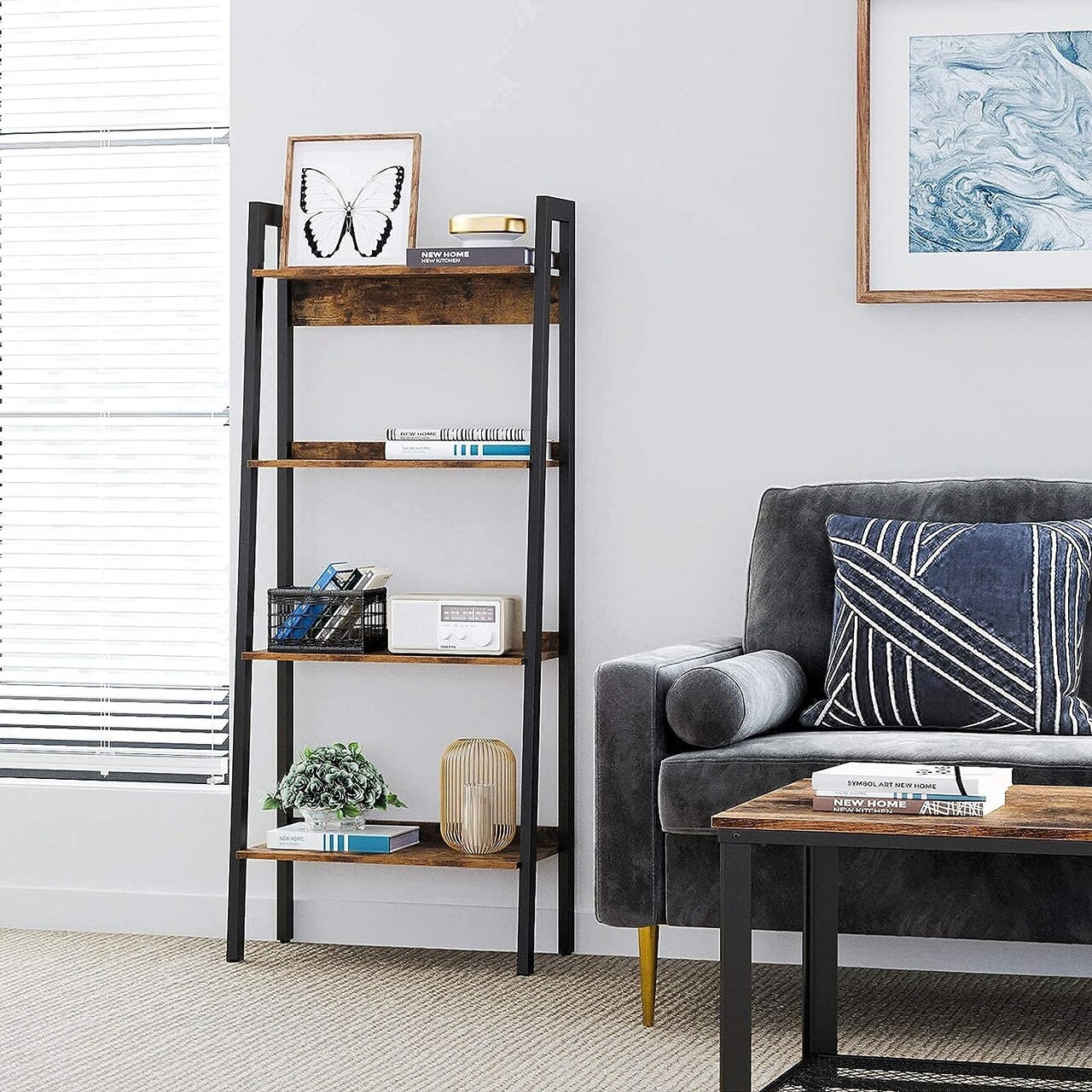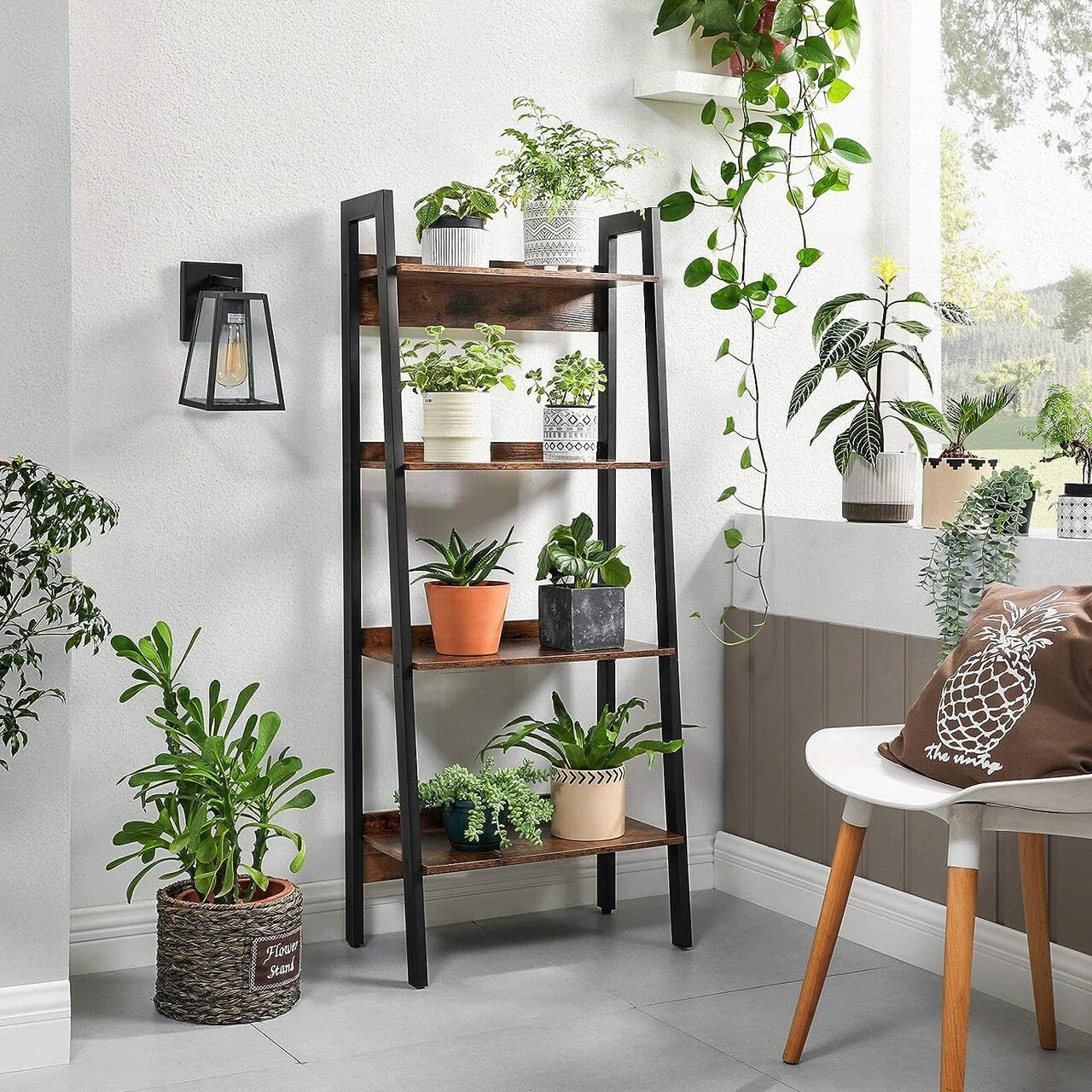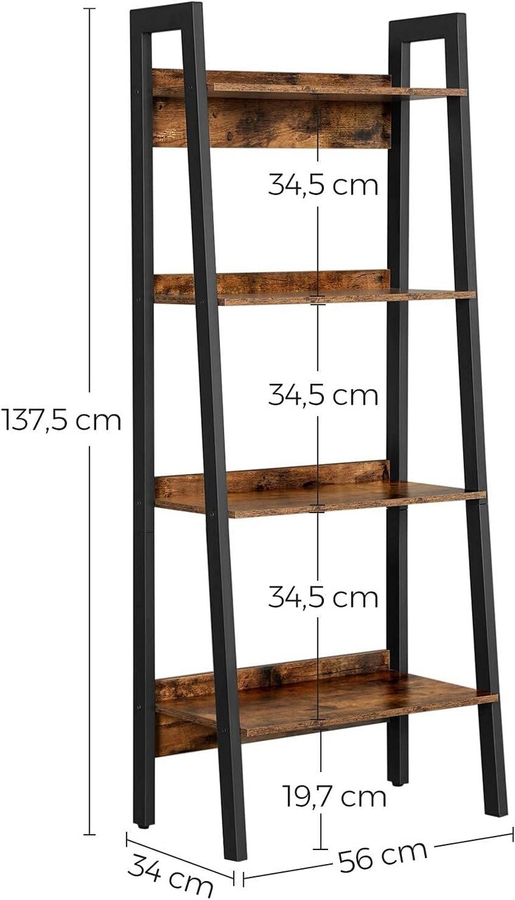 Raftul maro rustic cu finisaj texturat adauga o nota de caracter spatiului dvs. de locuit. Placile din spate previn caderea obiectelor, consolidand in acelasi timp stabilitatea sa generala. Datorita cadrului din otel negru mat, acest raft cu scara emana un aer industrial cuceritor.