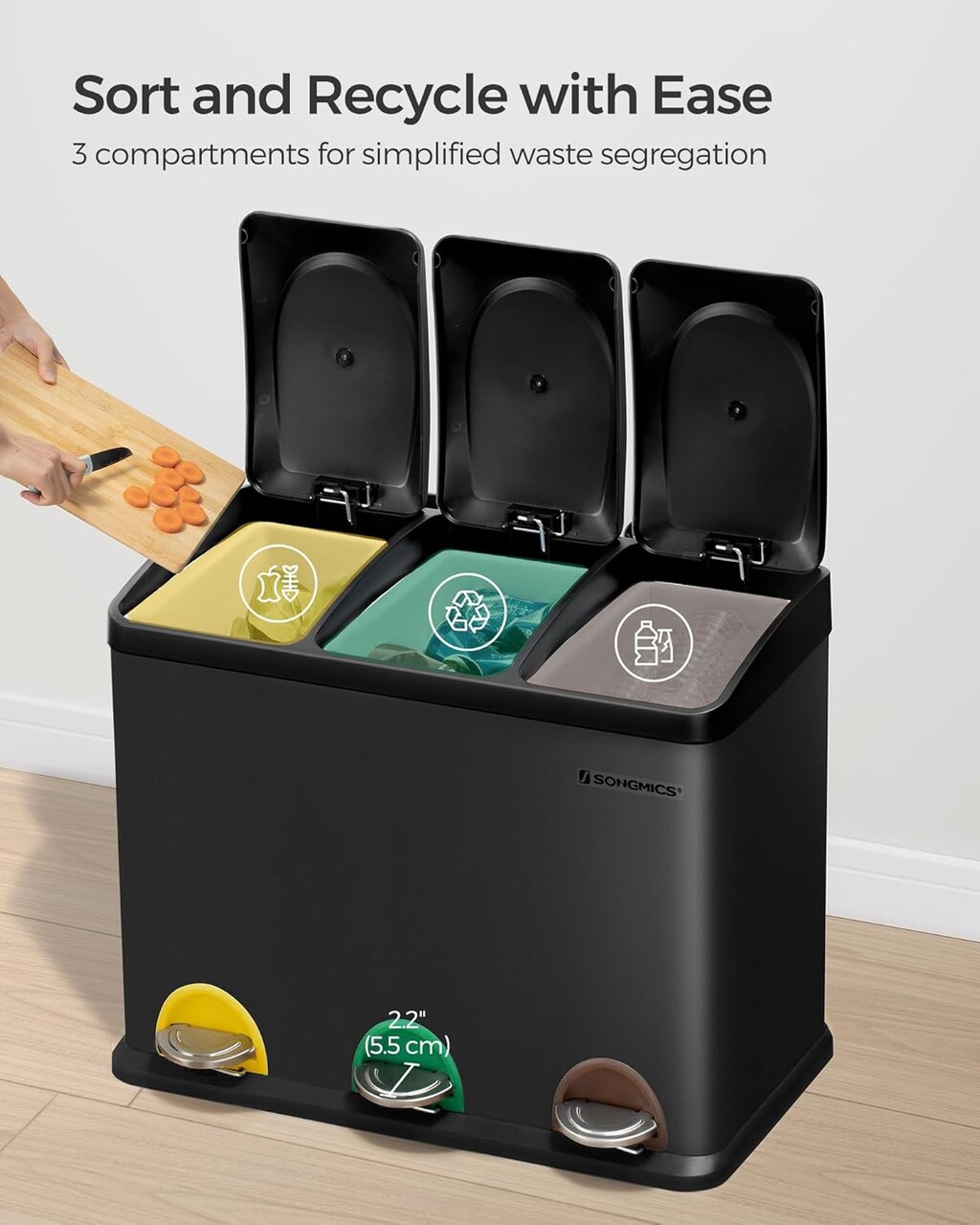 Cos de gunoi colectare selectiva 3 x 15 L, Songmics, 60.5x40.5x48.5 cm, inox, negru