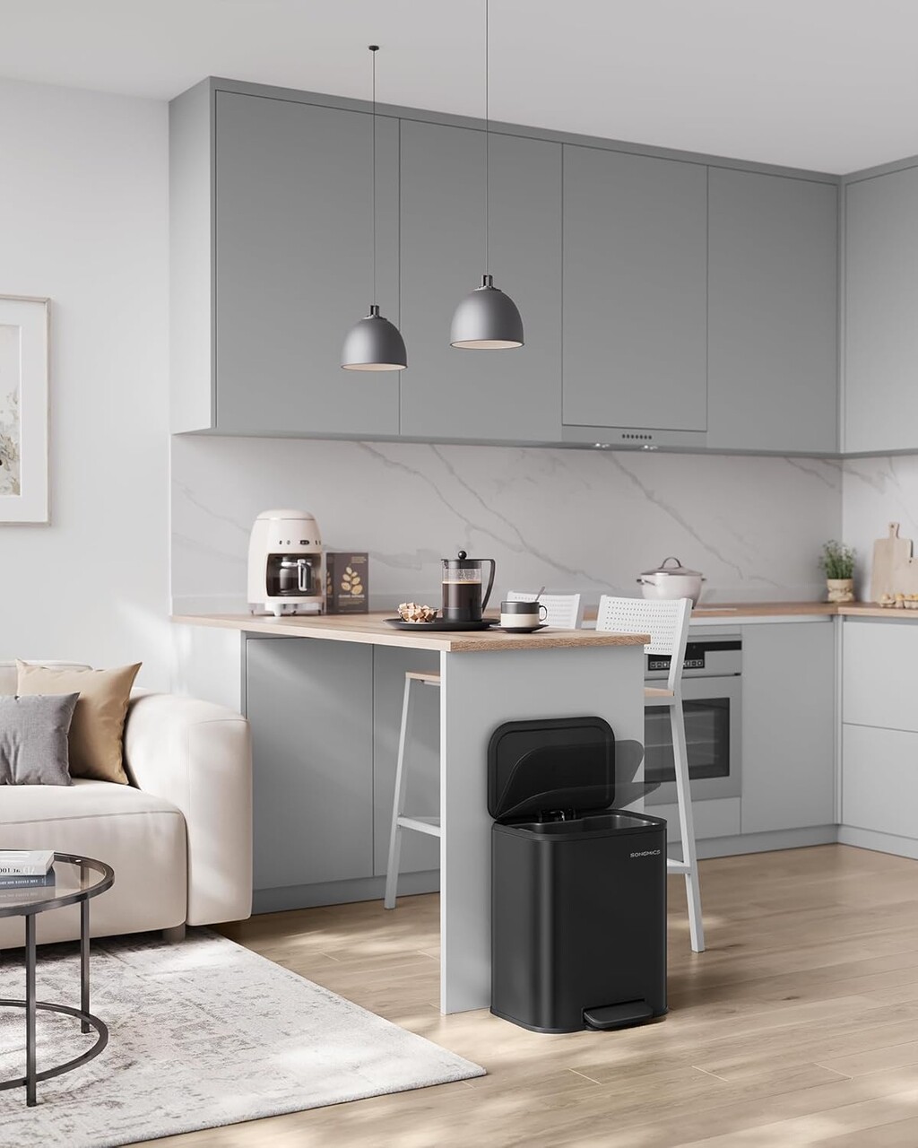 Compact si elegant: Acest cos de gunoi de 20L este perfect pentru spatii mici si ideal pentru una sau doua persoane. Designul sau modern si minimalist se integreaza usor in orice stil de amenajare interioara.