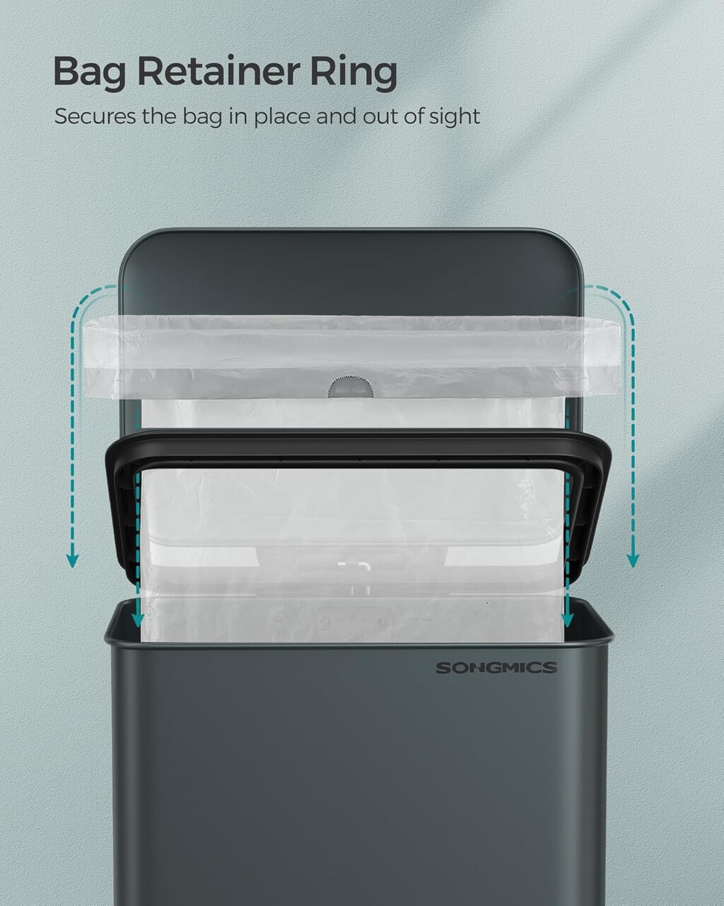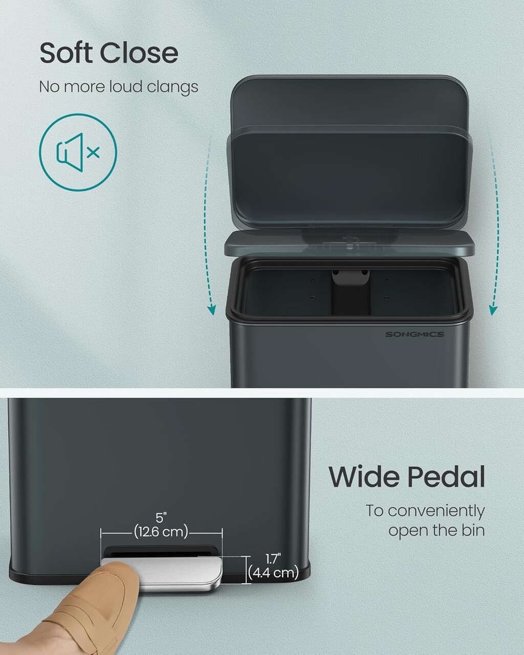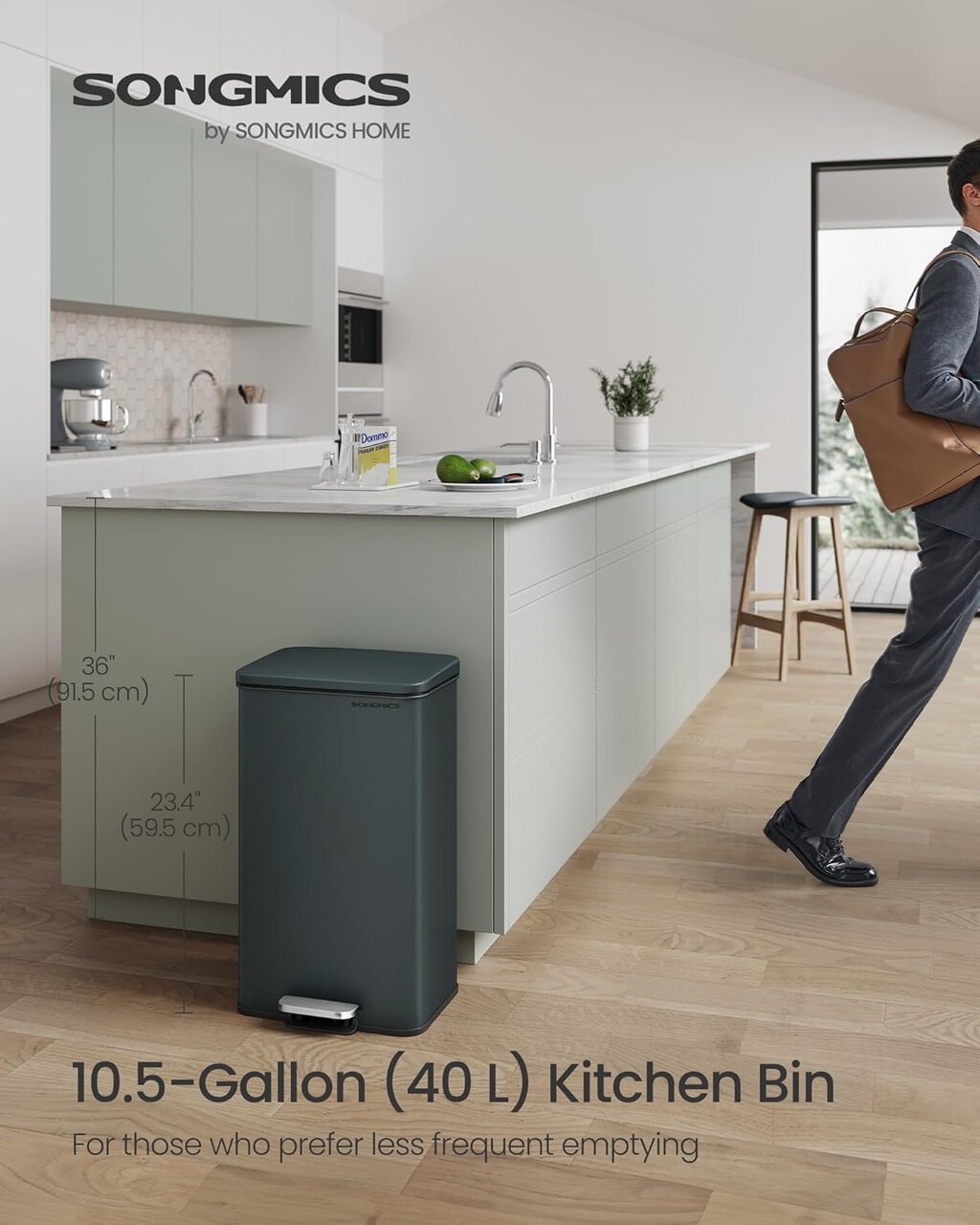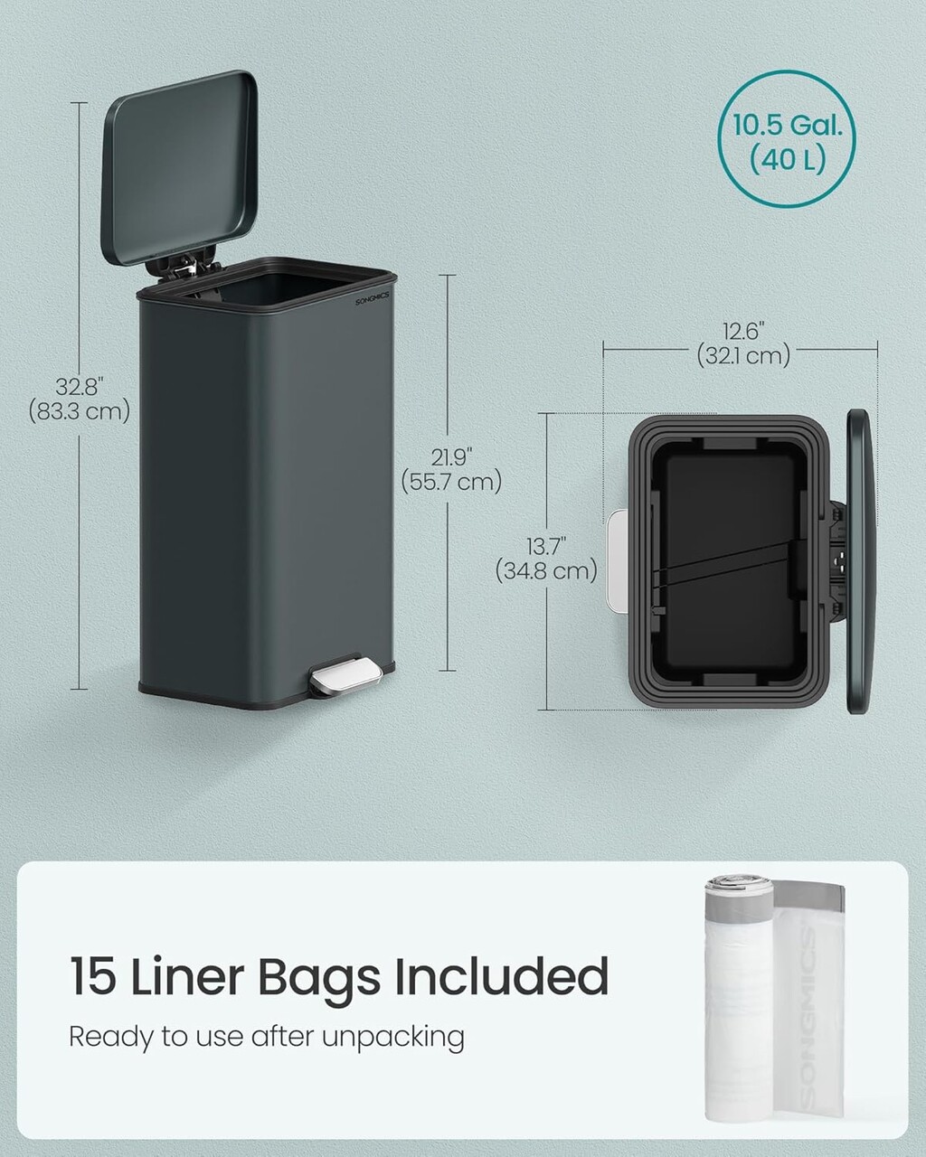 Cos de gunoi cu pedala 40 L, Songmics, inchidere soft close, include 15 saci de gunoi, 34.5x32x59.5 cm, otel, negru
