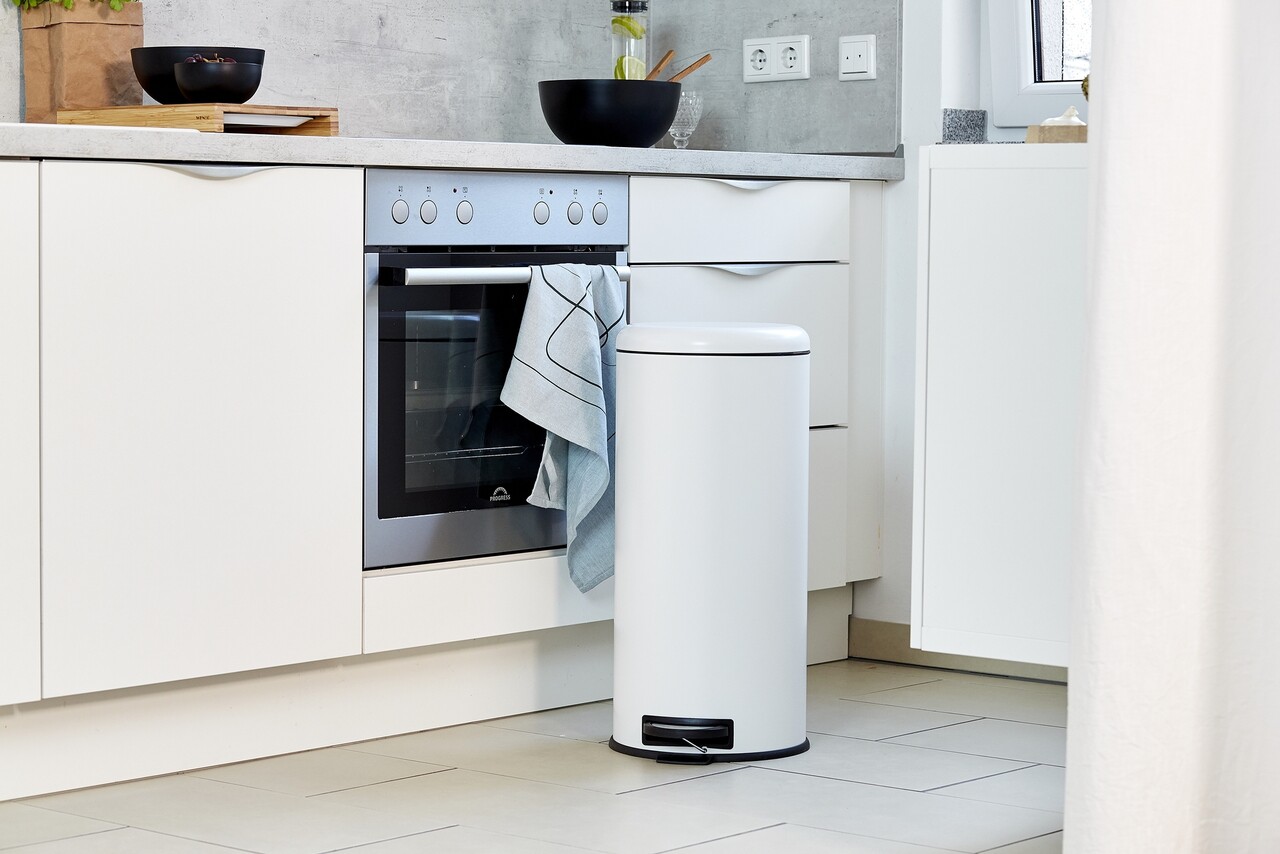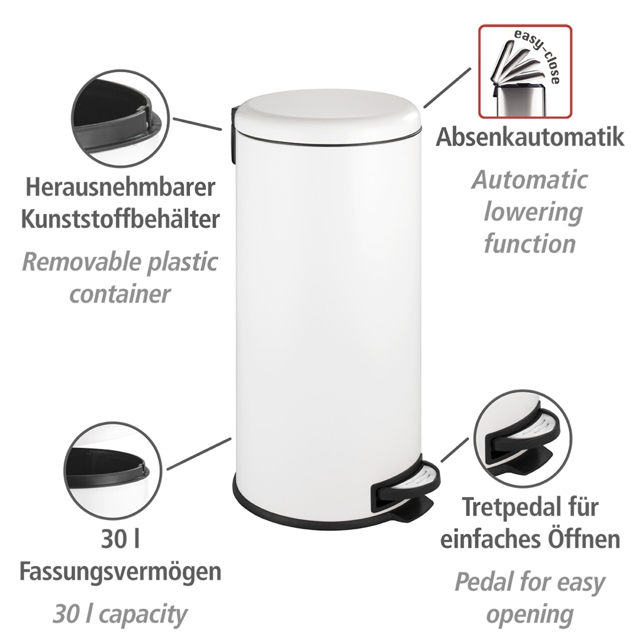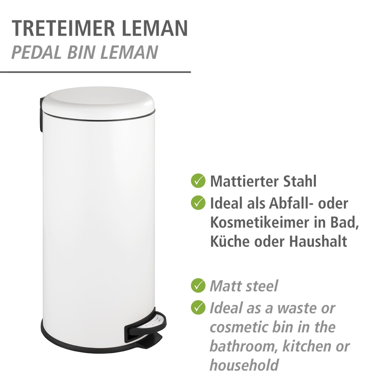 Cos de gunoi cu pedala Leman, Wenko, 30.5x37.5x64 cm, otel/polipropilena, alb/negru