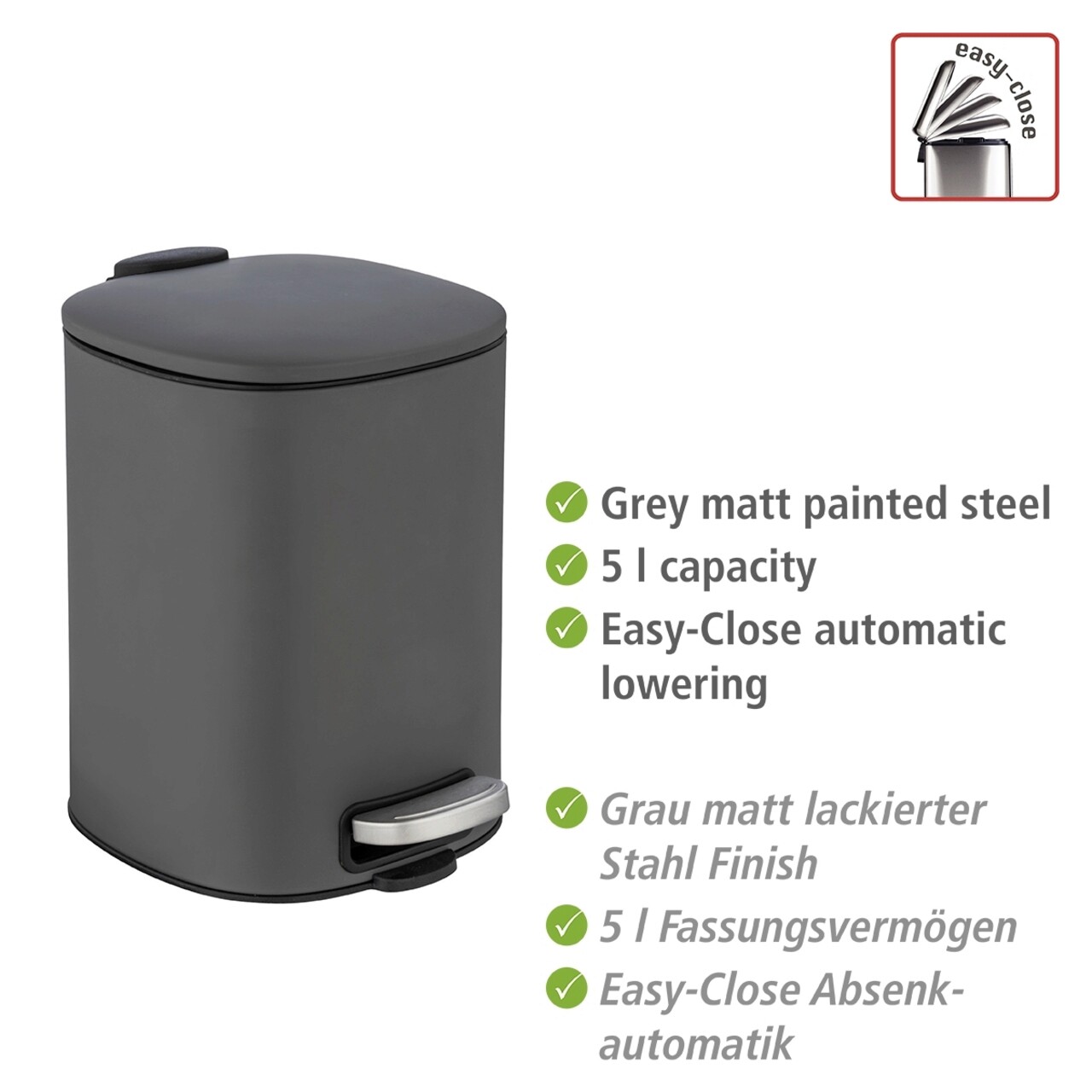 Cos de gunoi, Wenko, Alassio, 20.5 x 24.5 x 27 cm, 5 L, inox/polipropilena, gri/negru