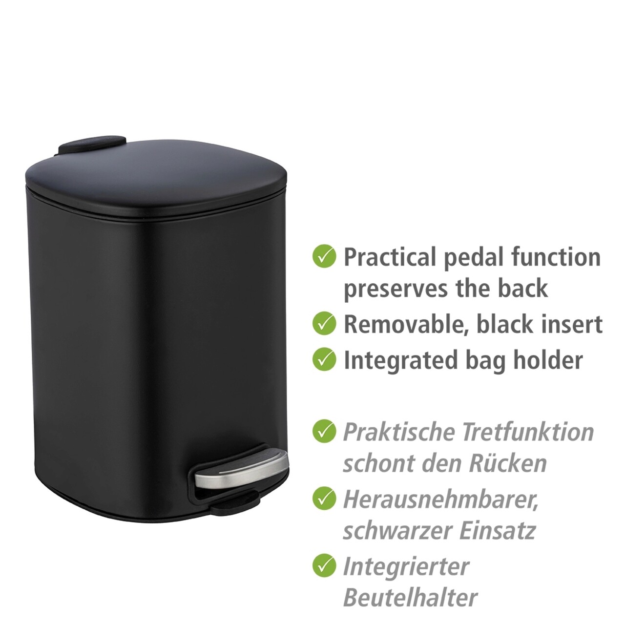 Cos de gunoi, Wenko, Alassio, 20.5 x 24.5 x 27 cm, 5 L, inox/polipropilena, negru
