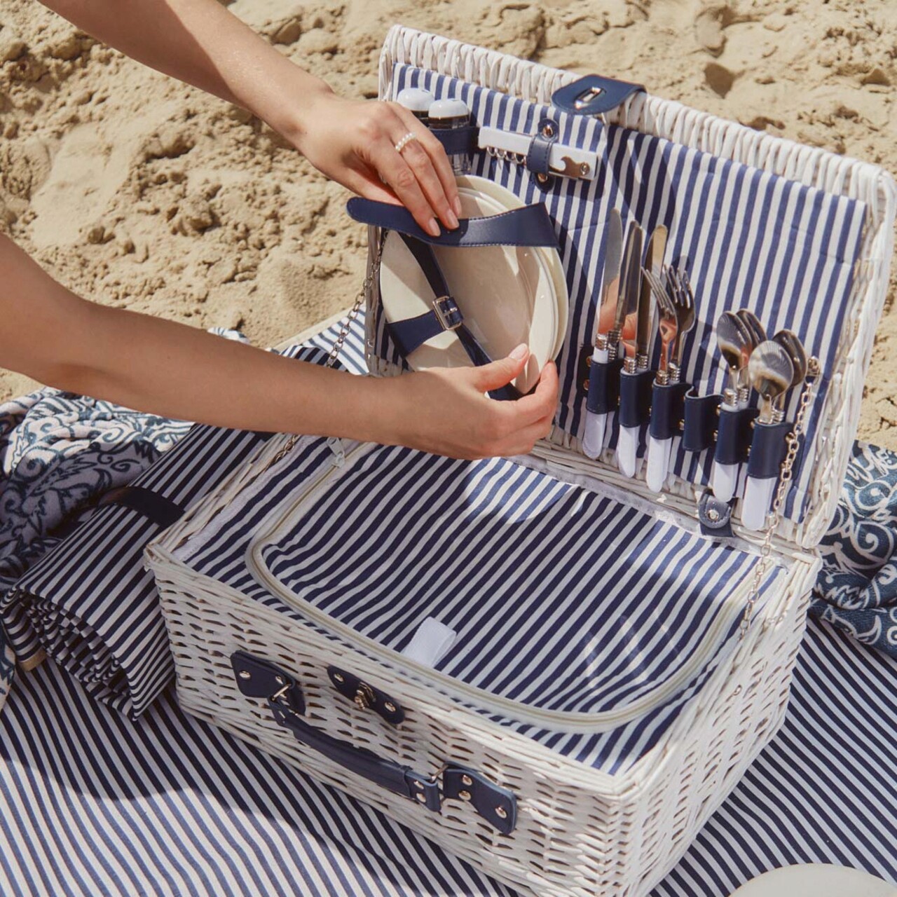 Include 4 cutite, 4 furculite, 4 linguri, 4 farfurii, 4 farfurii, 4 pahare de plastic, 1 pipernita, 1 solnita si 1 briceag cu tirbuson. De asemenea, include o patura de picnic 130 x 150 cm pe care va puteti aseza confortabil si pe care puteti intinde gustarile.