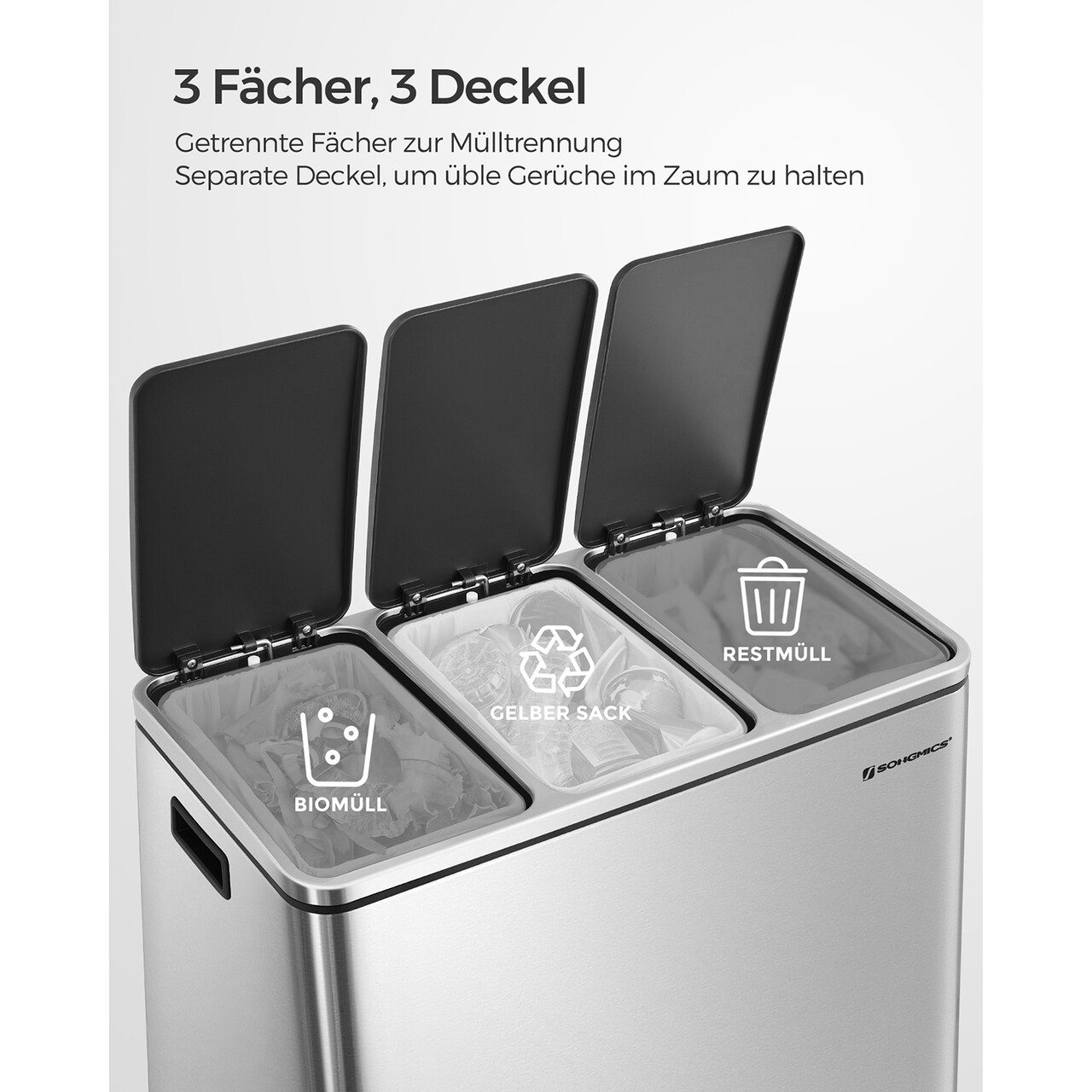 Cos de reciclare cu 3 compartimente, Songmics, 3 x 18 L, 61x31.5x56 cm, inox/polipropilena, argintiu