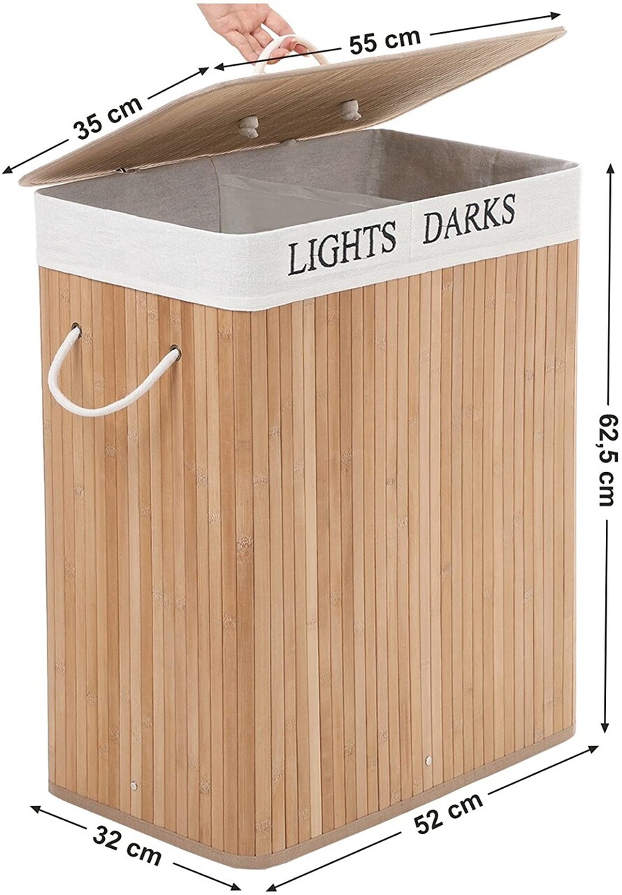 Cos de rufe cu 2 compartimente Bamboo, Songmics, 52 x 32 x 63 cm, 100 L, bambus/bumbac