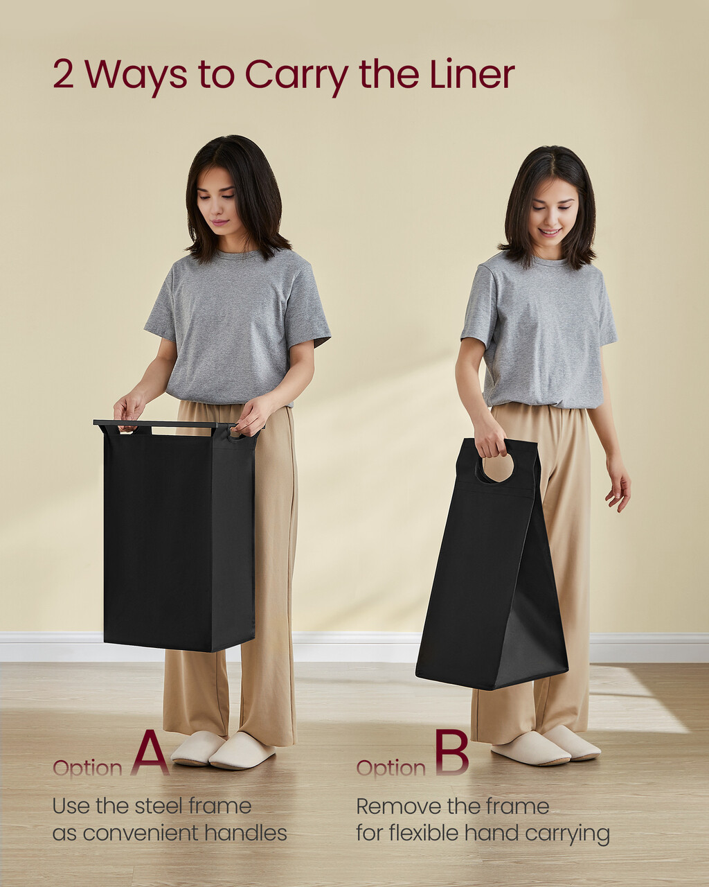 Fiecare sac este prevazut cu un panou inferior din plastic pentru a preveni deformarea. Sistemul de prindere cu velcro permite scoaterea rapida a sacilor si transportul facil pana la masina de spalat.