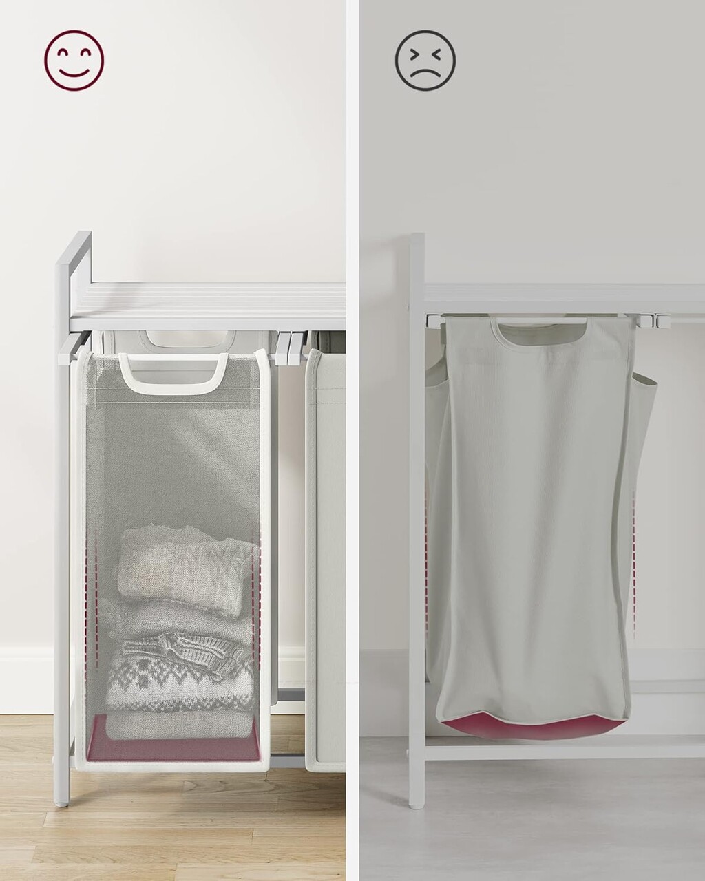 Robust si stabil Realizat cu un cadru din tuburi de otel de 2 cm si un panou MDF, acest cos de rufe suporta pana la 20 kg pe raftul superior. In plus, fiecare captuseala este realizata din tesatura Oxford hidrofuga, iar cele patru picioare reglabile asigura stabilitate. Greutate maxima suportata per cos: 10 kg. Greutate maxima suportata totala: 30 kg.