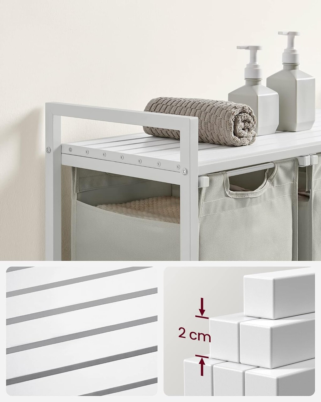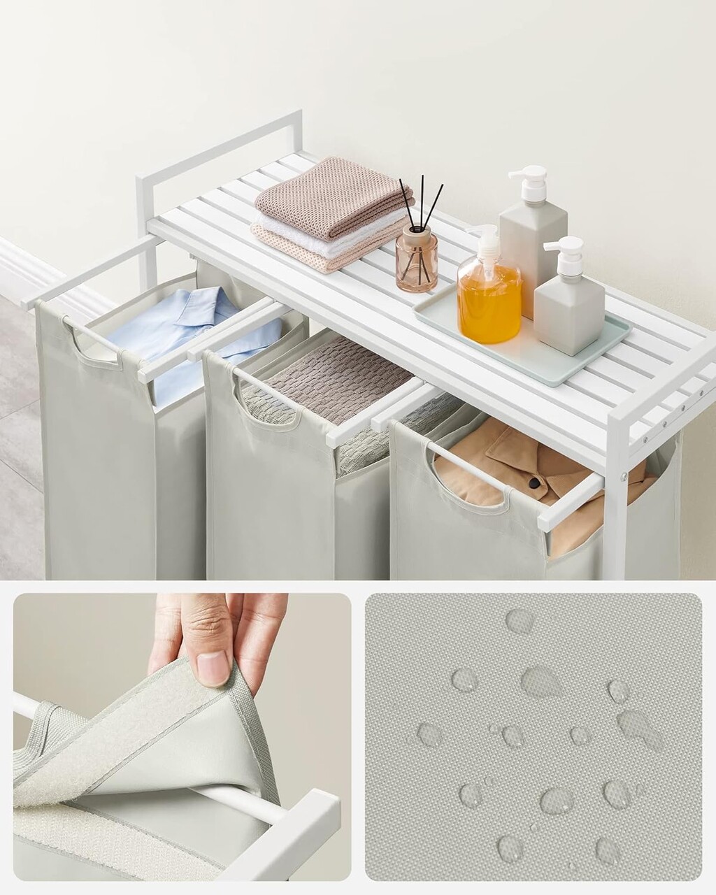 Cos de rufe cu 3 compartimente si raft depozitare, Vasagle, 92.5x33x72 cm, 3 x 38 L, MDF/tesatura Oxford, alb