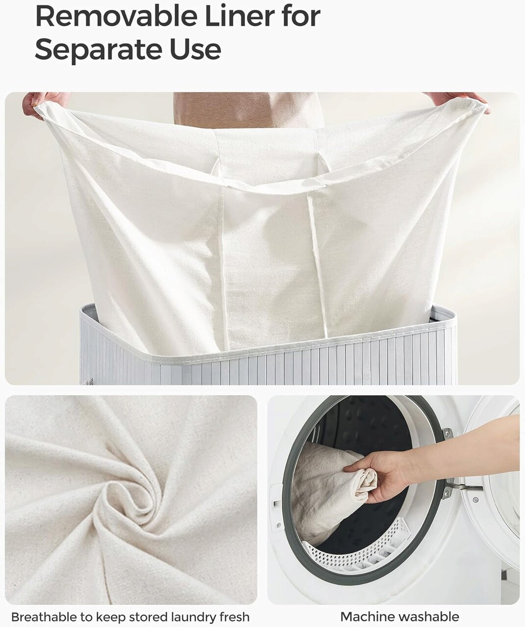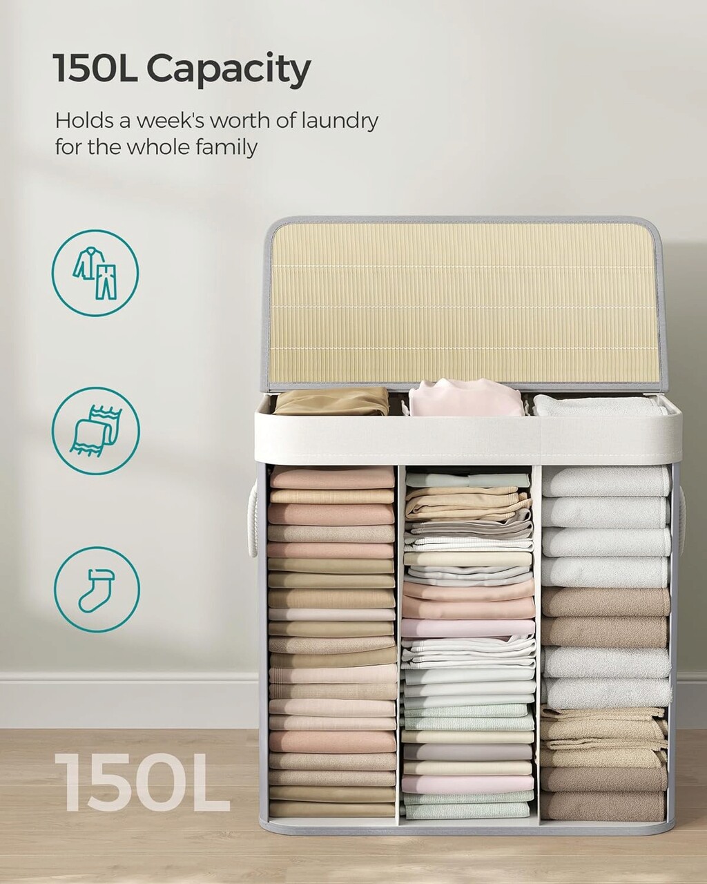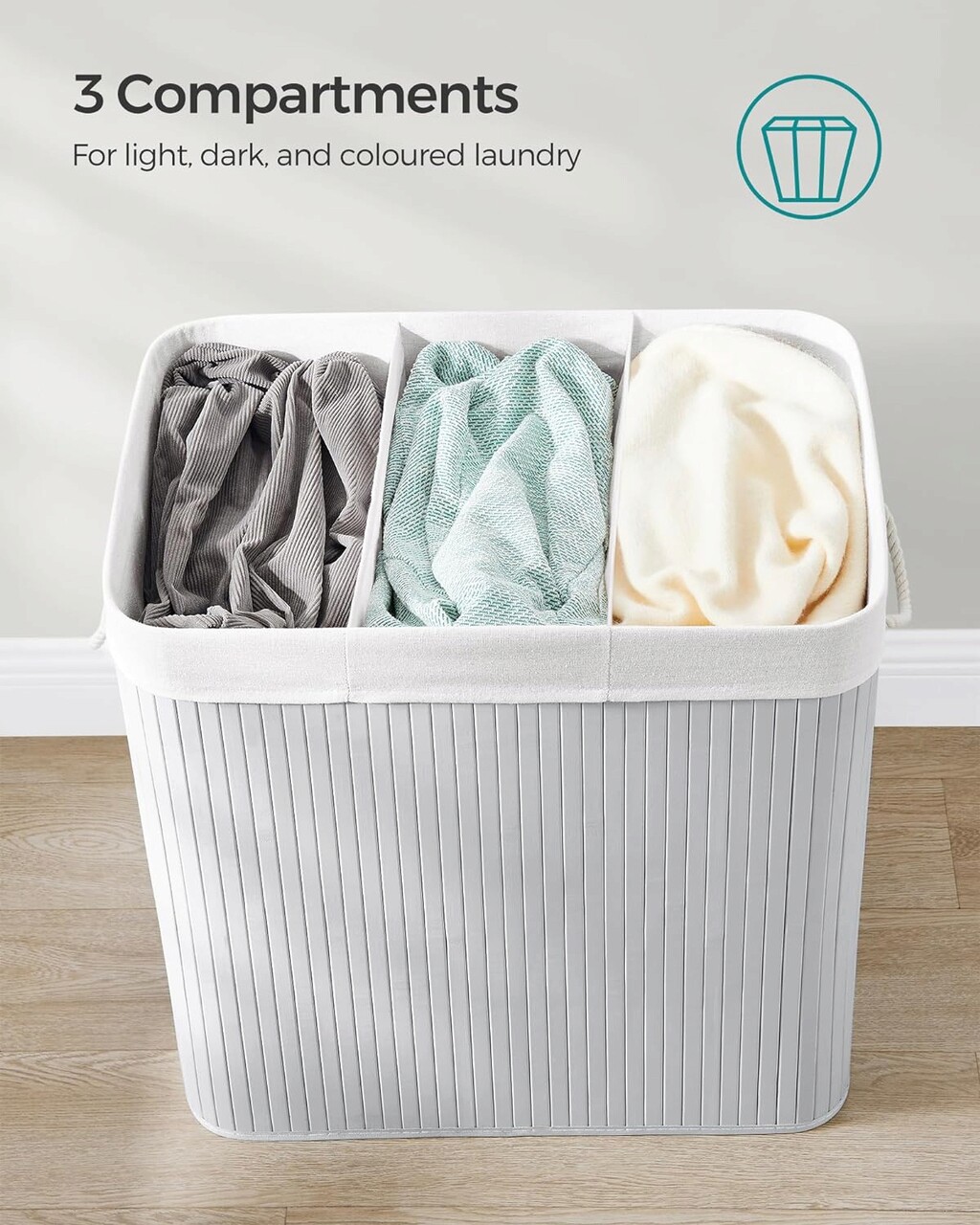 Cos de rufe cu 3 compartimente, Songmics, 60 x 40 x 61.5 cm, bambus, 150 L, bambus, gri