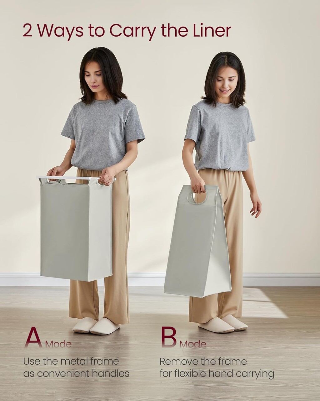 Sacii sunt prevazuti cu un panou inferior din plastic care mentine forma si previne lasarea materialului. Sistemul de prindere cu velcro permite scoaterea rapida si transportul facil pana la masina de spalat.