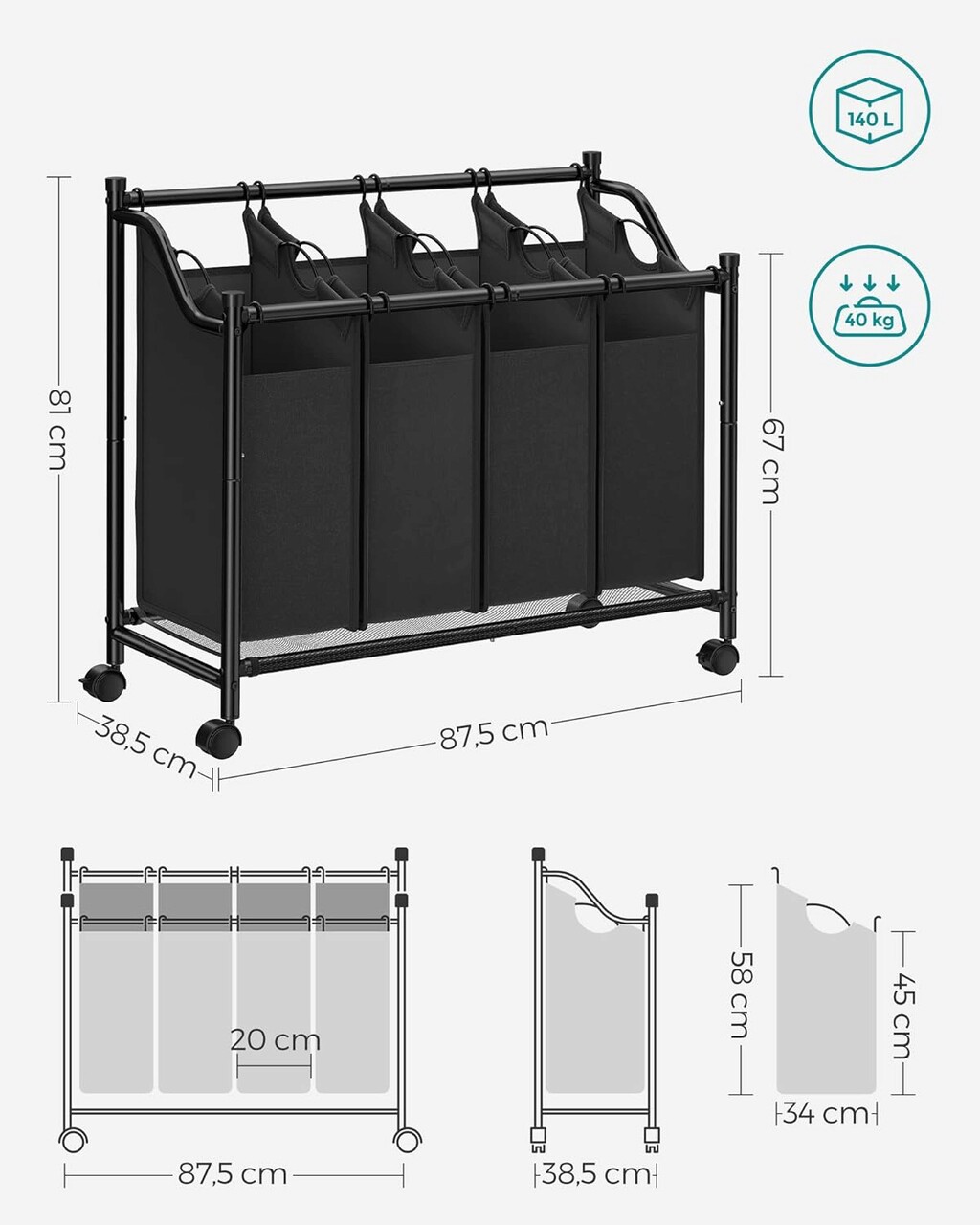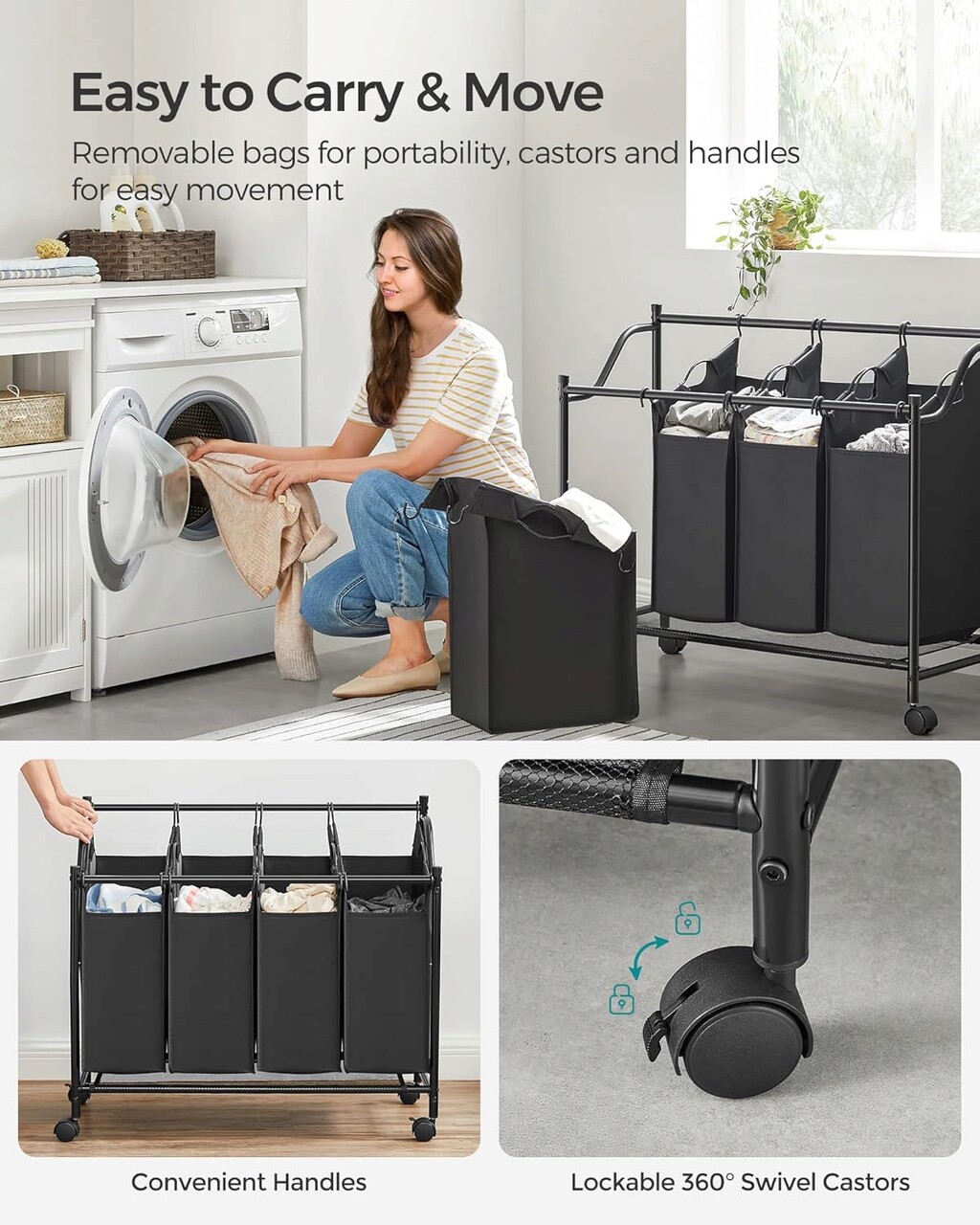 Cos de rufe cu 4 compartimente si roti, Songmics, 4 x 35 L, 87.5 x 38.5 x 81 cm, fier/tesatura oxford, negru