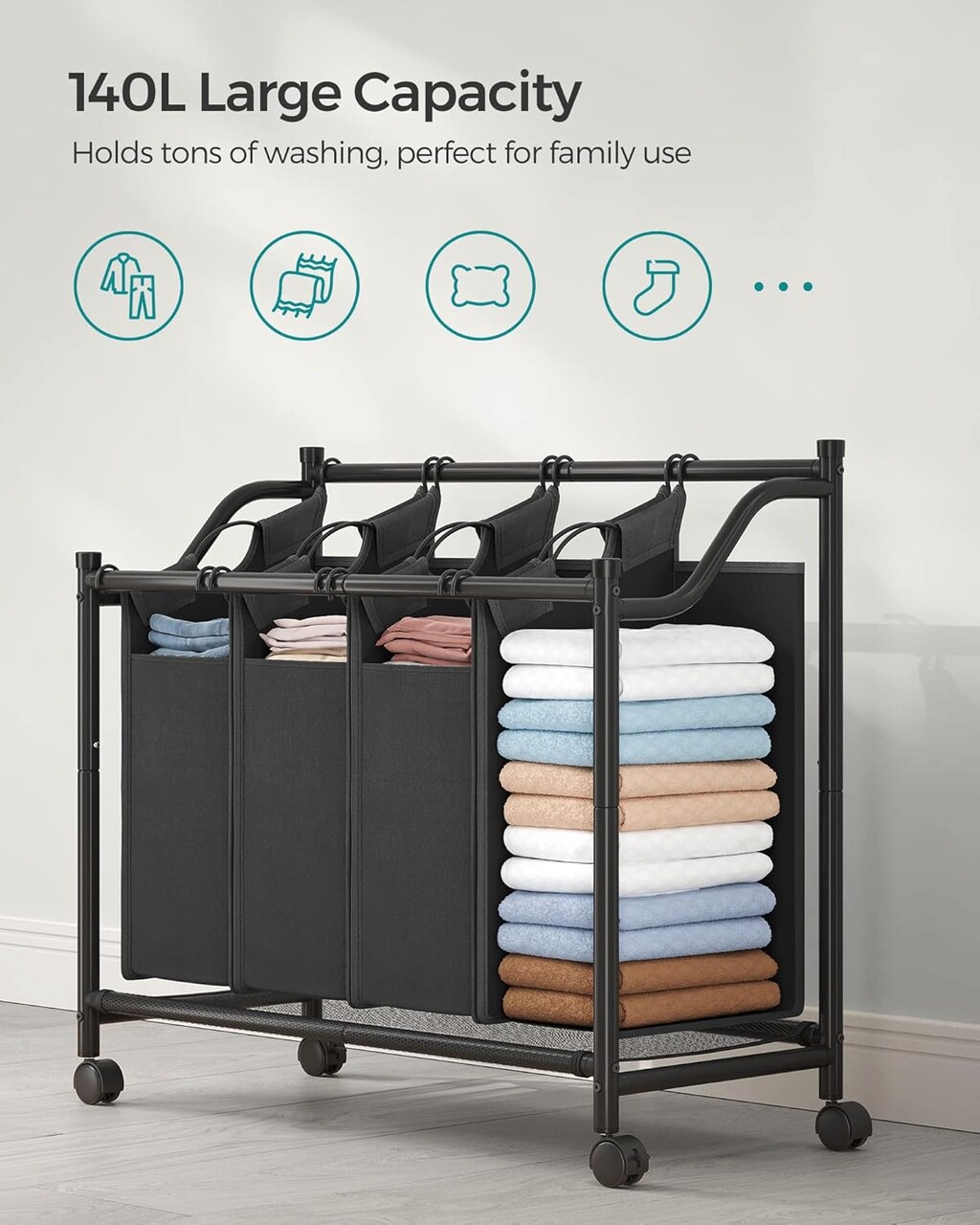 140L, capacitate mare de depozitare Acest cos de rufe cu 4 saci are o capacitate totala de depozitare de 140 de litri pentru a va pastra toate rufele de uz casnic intr-un singur loc si organizate, eliminand gramezile de haine imprastiate pe toata podeaua.