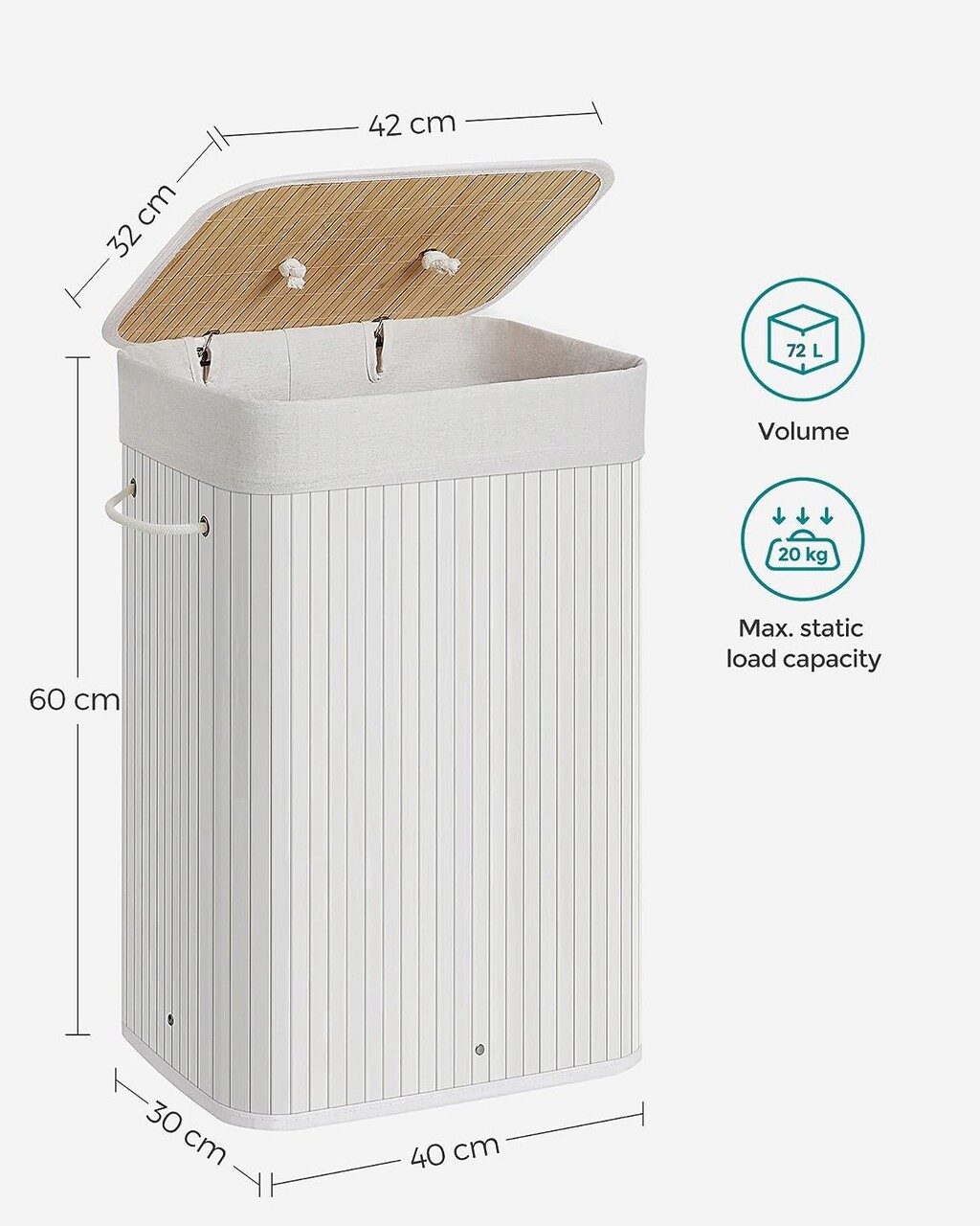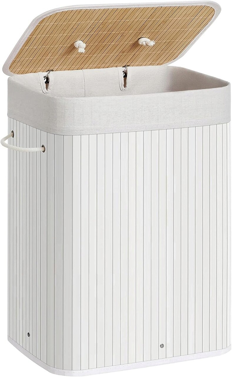 Cos de rufe, Songmics, 40 x 30 x 60 cm, 72 L, bambus/fier, alb