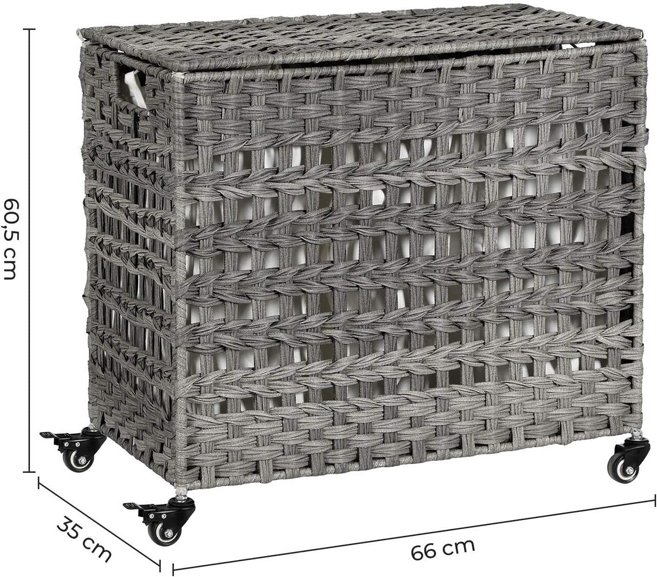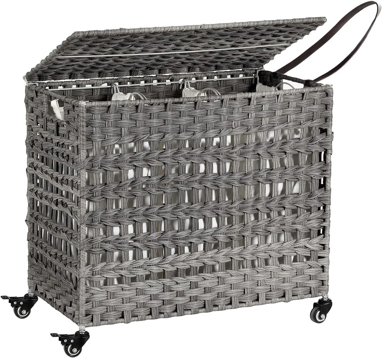 Cos de rufe tesut manual cu 3 compartimente si roti, Songmics, 140 L, 66x36x60 cm, poliratan/metal/bumbac, gri