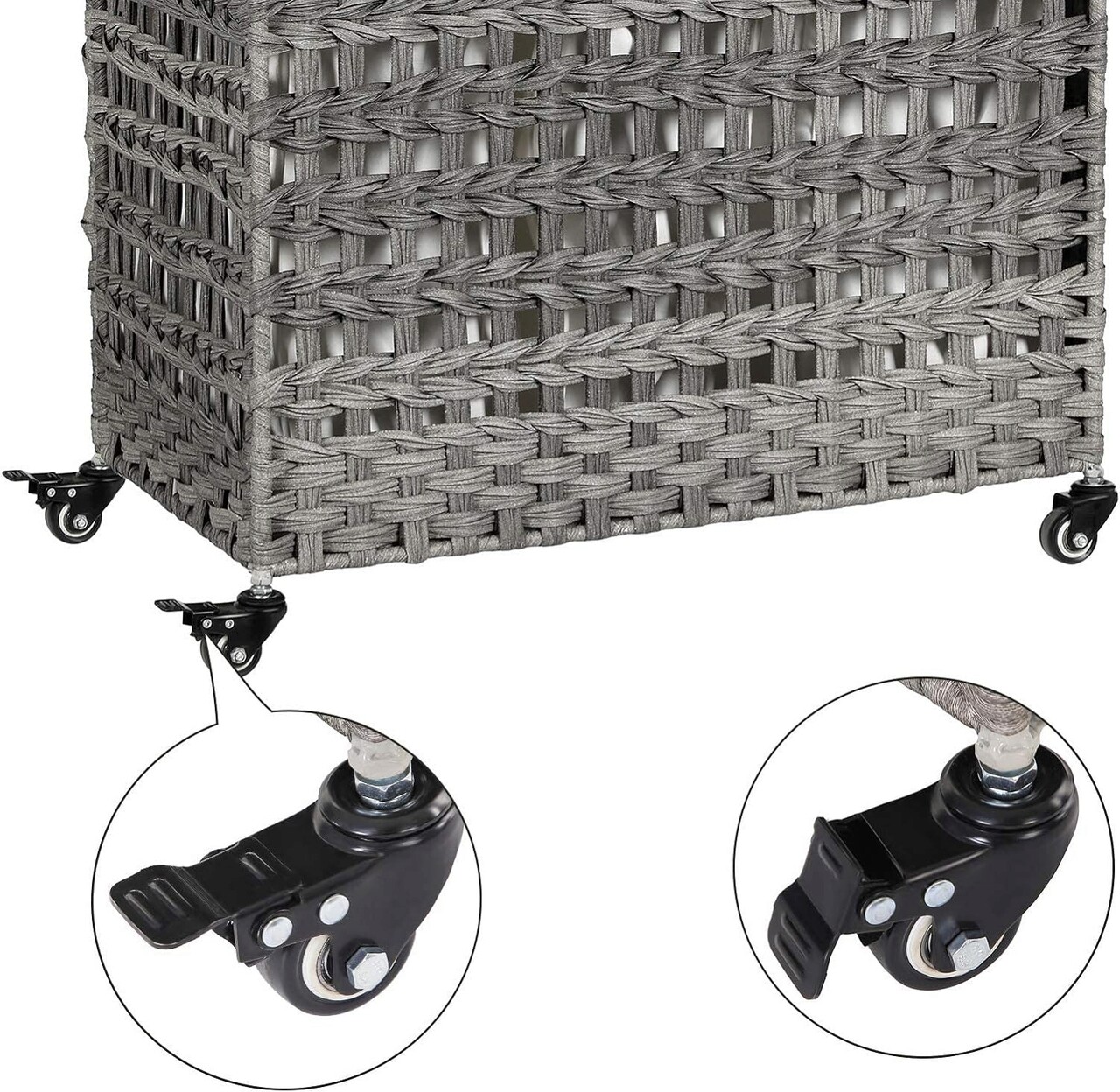 Prevazut cu roti Datorita celor 4 roti si curelei elegante din imitatie de piele, chiar si un copil poate impinge sau trage acest cos la masina de spalat. Cele 2 frane va permit sa fixati caruciorul de rufe intr-un singur loc.