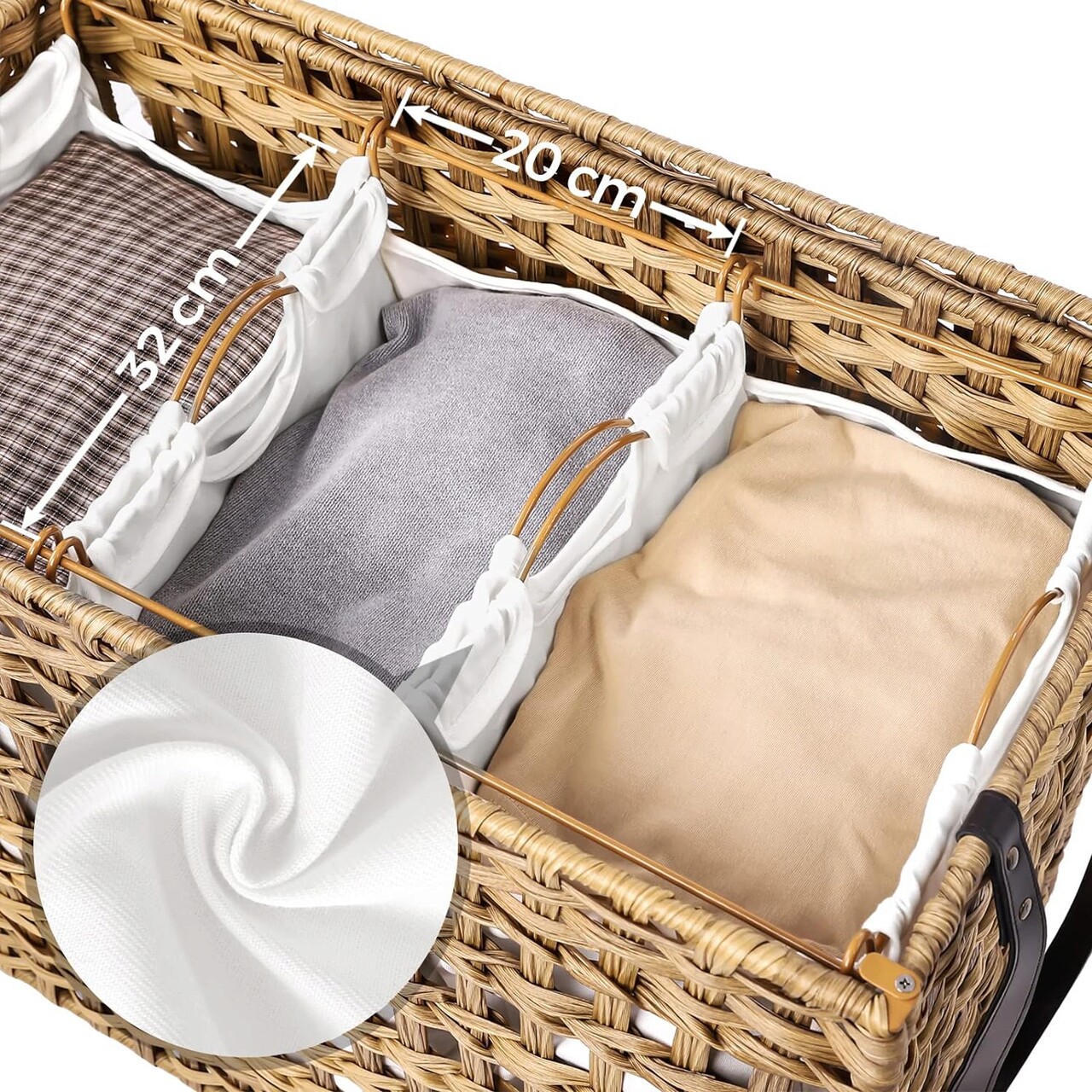 Cos de rufe tesut manual cu 3 compartimente si roti, Songmics, 140 L, 66x36x60 cm, poliratan/metal/bumbac, natural