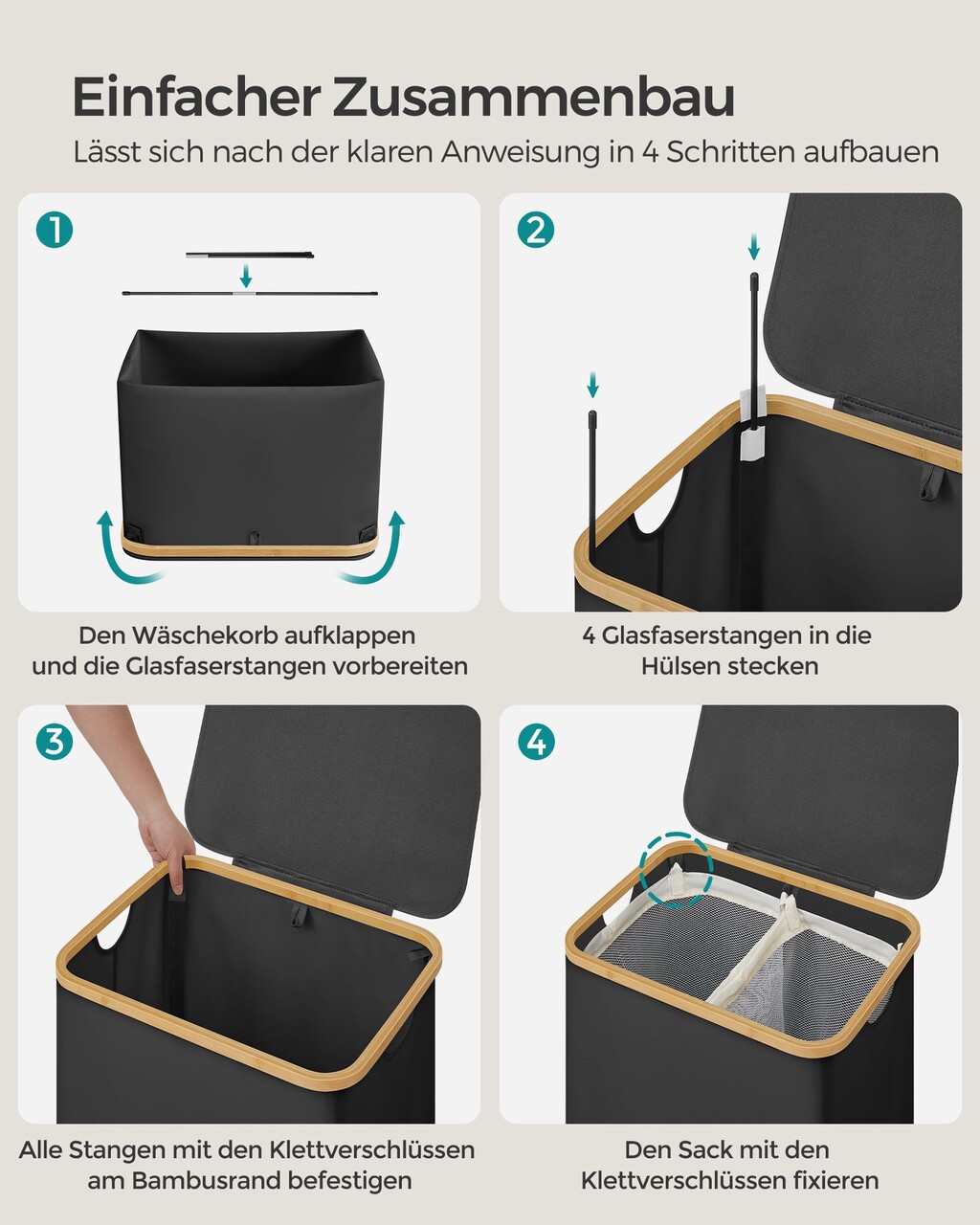 Cos de rufe textil cu 2 compartimente, Songmics, 52x38.5x70.5 cm, 130 L, bambus/tesatura Oxford, negru