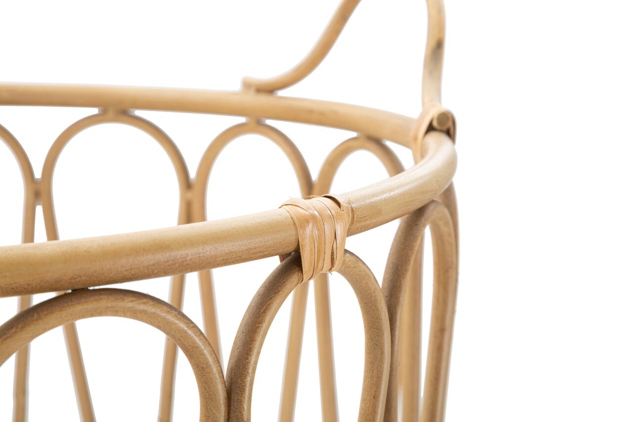 Cos rotund din metal cu finisaj din ratan, cu un design care aminteste de cosurile clasice din bambus. Completate cu manere practice.